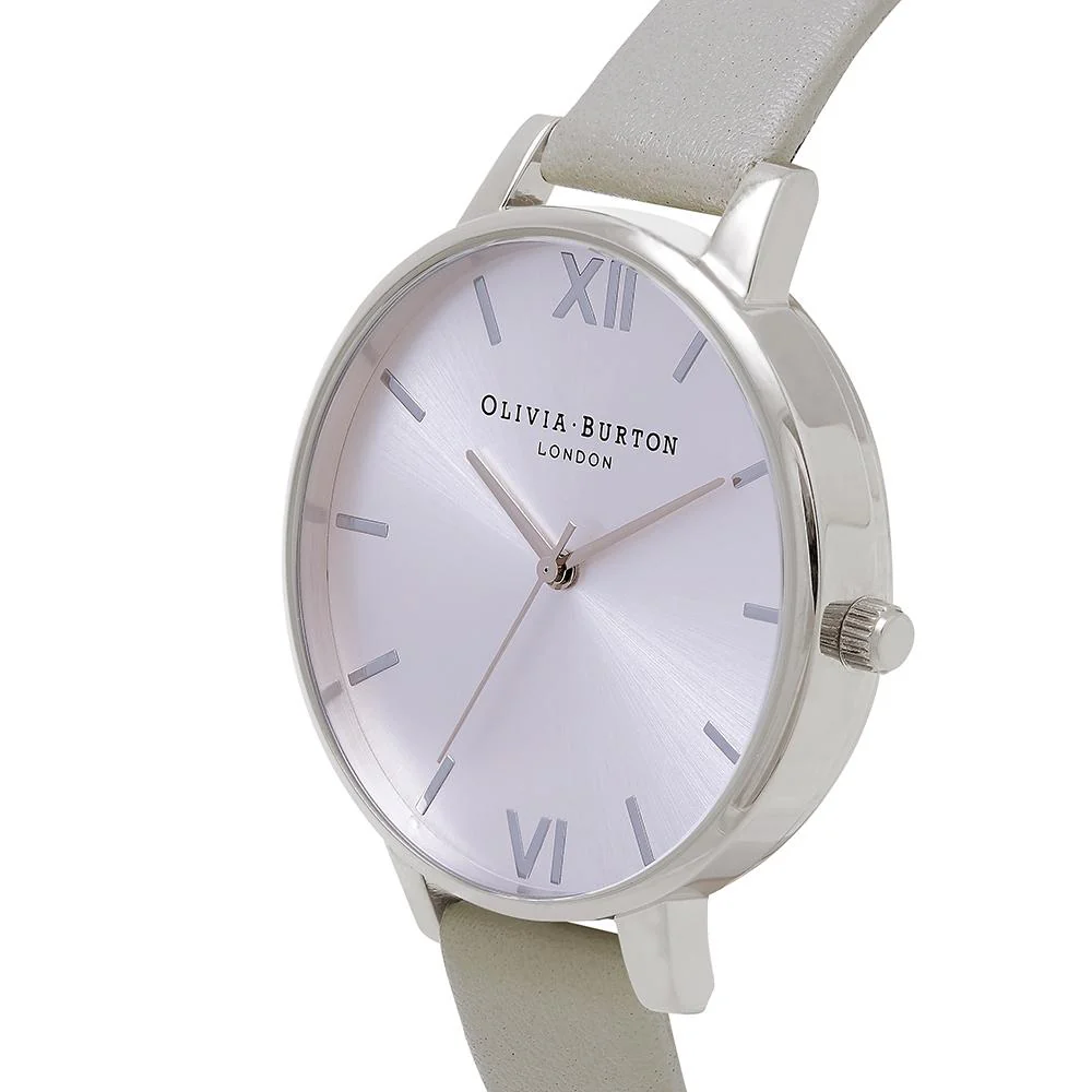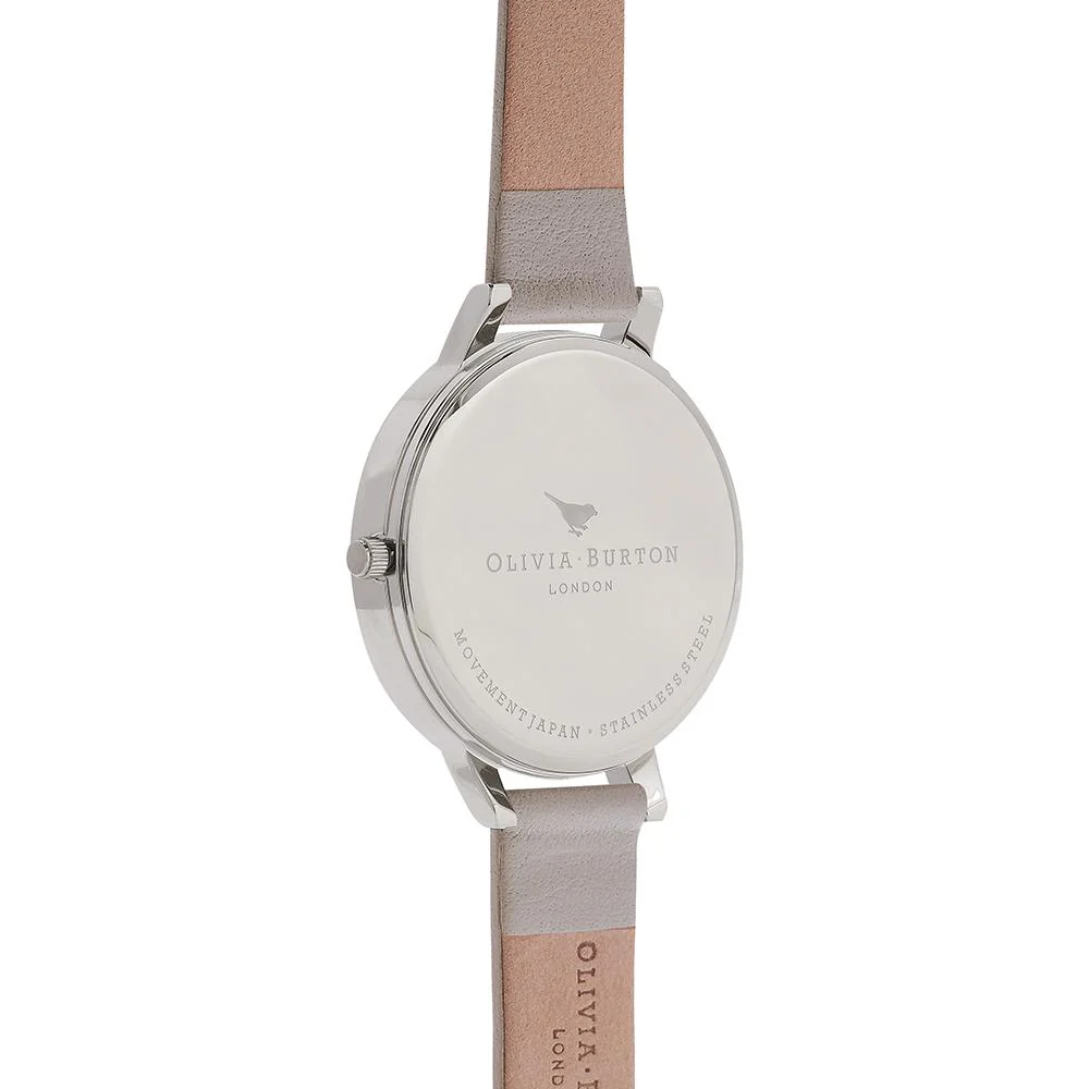 Olivia Burton presents the Big Dial collection of watches. Luxe silver-grey colour palette, this watch has got cool contemporary style covered. This stunning time piece featuring 38 mm wide sunray effect dial with metallic markers inclosed in silver plated stainless steel case and 12mm soft supple grey leather strap that wraps around the wrist comfortably is a chic and easy to wear choice. Embrace the oversized design to add a polished touch to every ensemble.