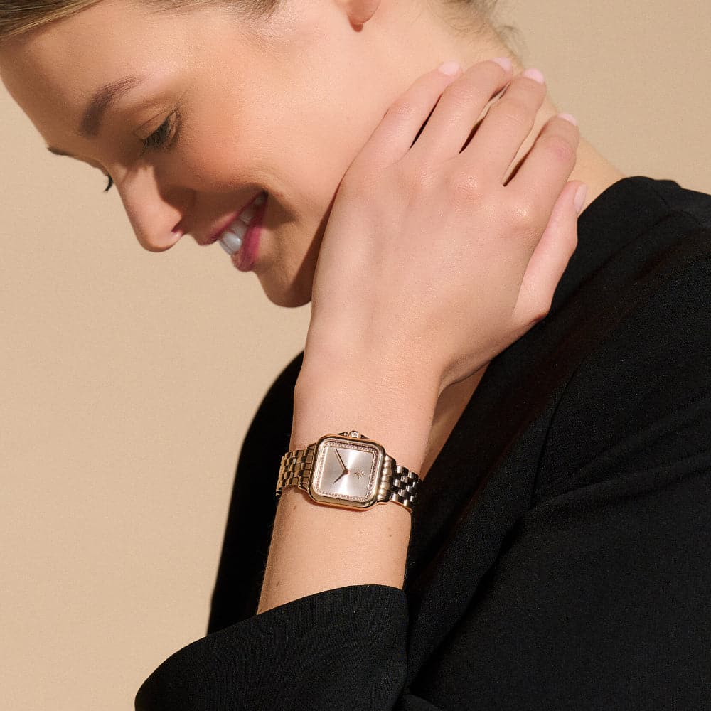 Get lost in London with the Grosvenor watch, inspired by the city’s streets, squares and iconic architecture. The latest addition to our Classics collection, the soft, rounded corners of the case are a feminine twist on a classic, angular shape. A shimmering Soft Blush sunray dial with crystal details frames our iconic North Star for that extra guiding light. The carnation gold-plated link bracelet strap and polished bezel give a luxe feel to a new classic. Cutting corners has never looked so good.