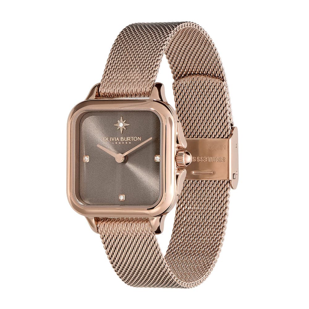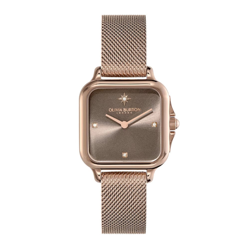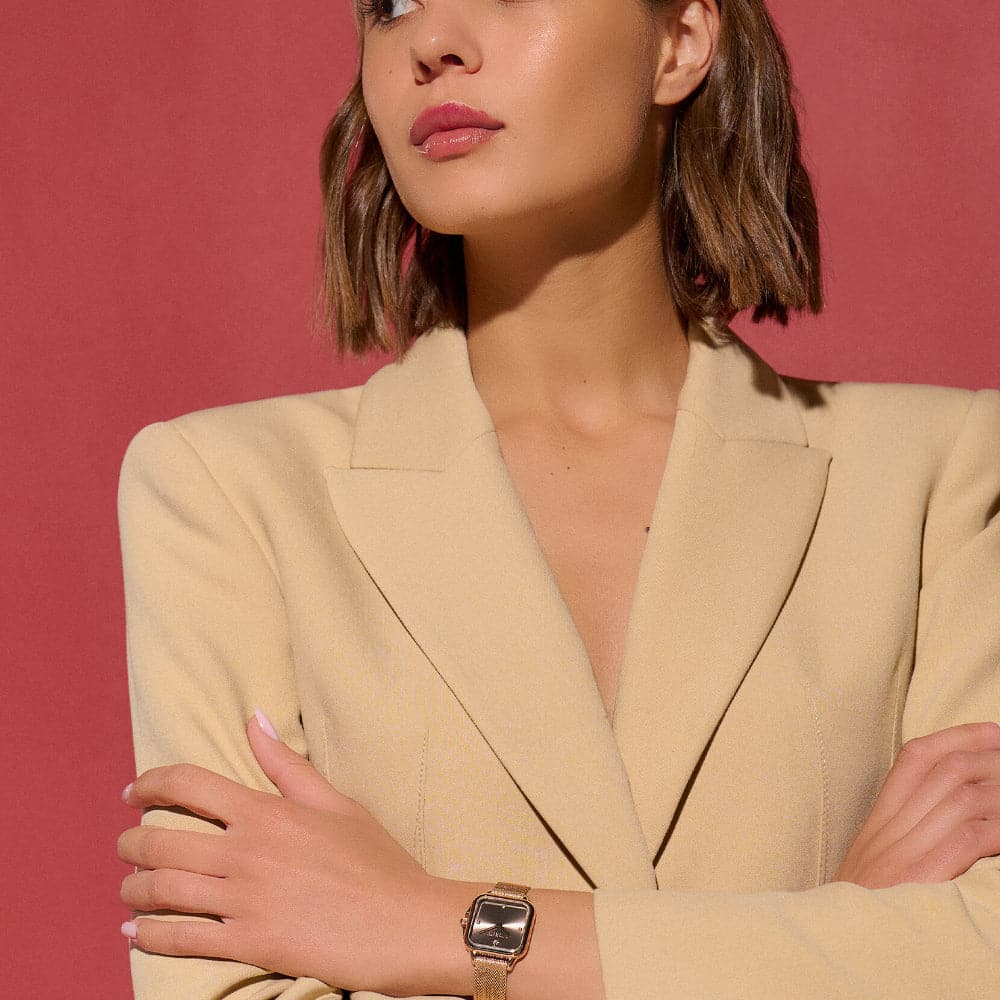 Get lost in London with the Grosvenor watch, inspired by the city’s streets, squares and iconic architecture. The latest addition to our Classics collection, the soft, rounded corners of the case are a feminine twist on a classic, angular shape. An on-trend mushroom sunray dial with crystal markers and carnation gold-plated mesh strap give a luxe feel to a new classic. Cutting corners has never looked so good.