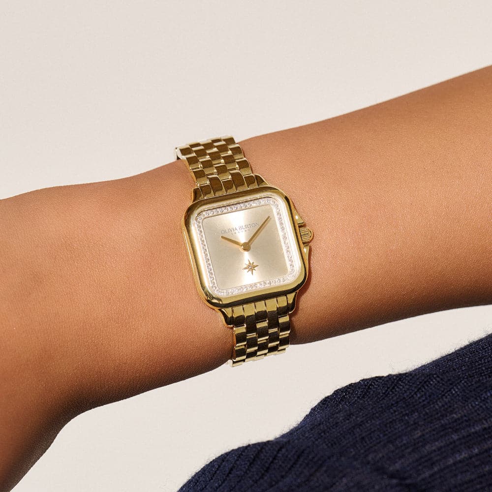Get lost in London with the Grosvenor watch, inspired by the city’s streets, squares and iconic architecture. The latest addition to our Classics collection, the soft, rounded corners of the case are a feminine twist on a classic, angular shape. A shimmering Light Gold sunray dial with crystal details frames our iconic North Star for that extra guiding light. The gold-plated link bracelet strap and polished bezel give a luxe feel to a new classic. Cutting corners has never looked so good.