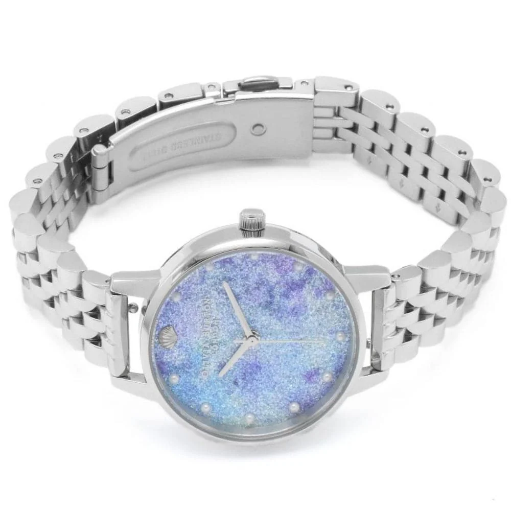 We’re getting serious underwater treasure vibes with this beautiful Deep Sea dial. A swirling wash of purples and blues provides the perfect backdrop for tiny faux pearl markers complete with an even tinier silver shell. Classic silver casing and mesh strap set off the ocean tones and give this little treasure timeless elegance.
