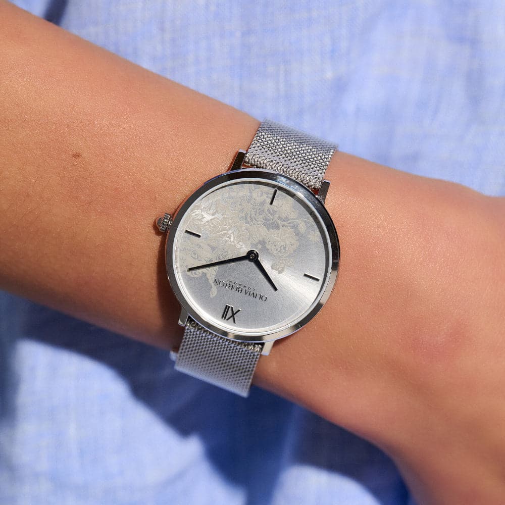 You’ll be smelling the roses and strolling in the countryside with our Floral Blooms watch in classic stainless steel. The latest addition to our Signature collection, beautiful English florals bloom across an ultra-slim sunray case. With silver mesh strap and cool grey accents, this watch brings an understated, contemporary feel to pretty, expressive florals. Picnic in the sun, anyone?
