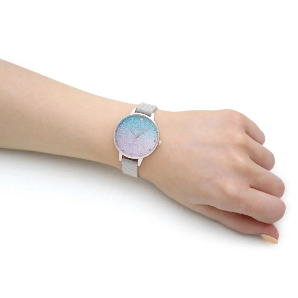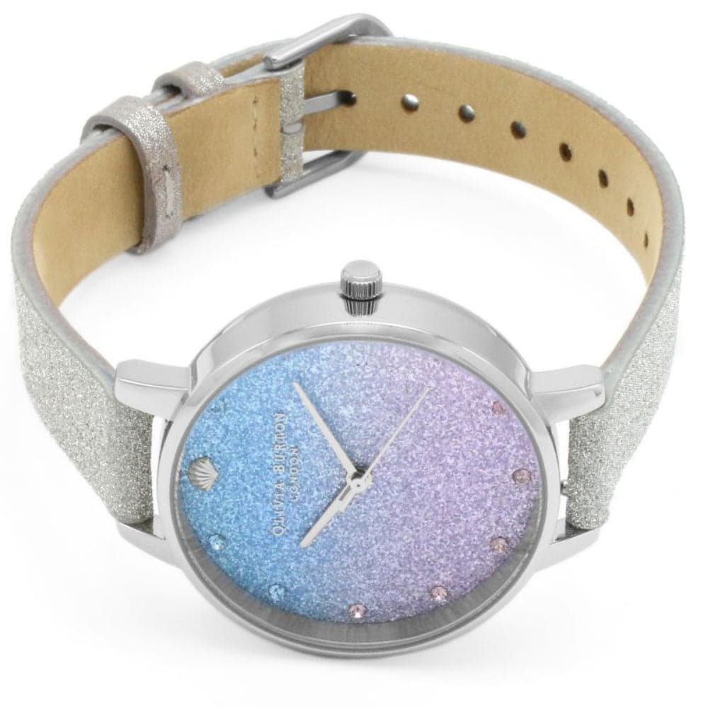 “You’ll be dancing with the waves wearing this beautifully sparkly Under The Sea dial from Olivia Burton. The glitter ombre Demi fades softly from blue into lilac, dotted with crystal markers, an adorably tiny little silver shell and matching hands. And just for a little extra shine, we’ve added our sparkle strap in a go-with-anything silver. Go forth and sparkle.