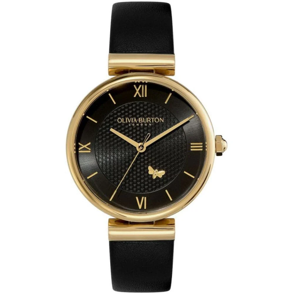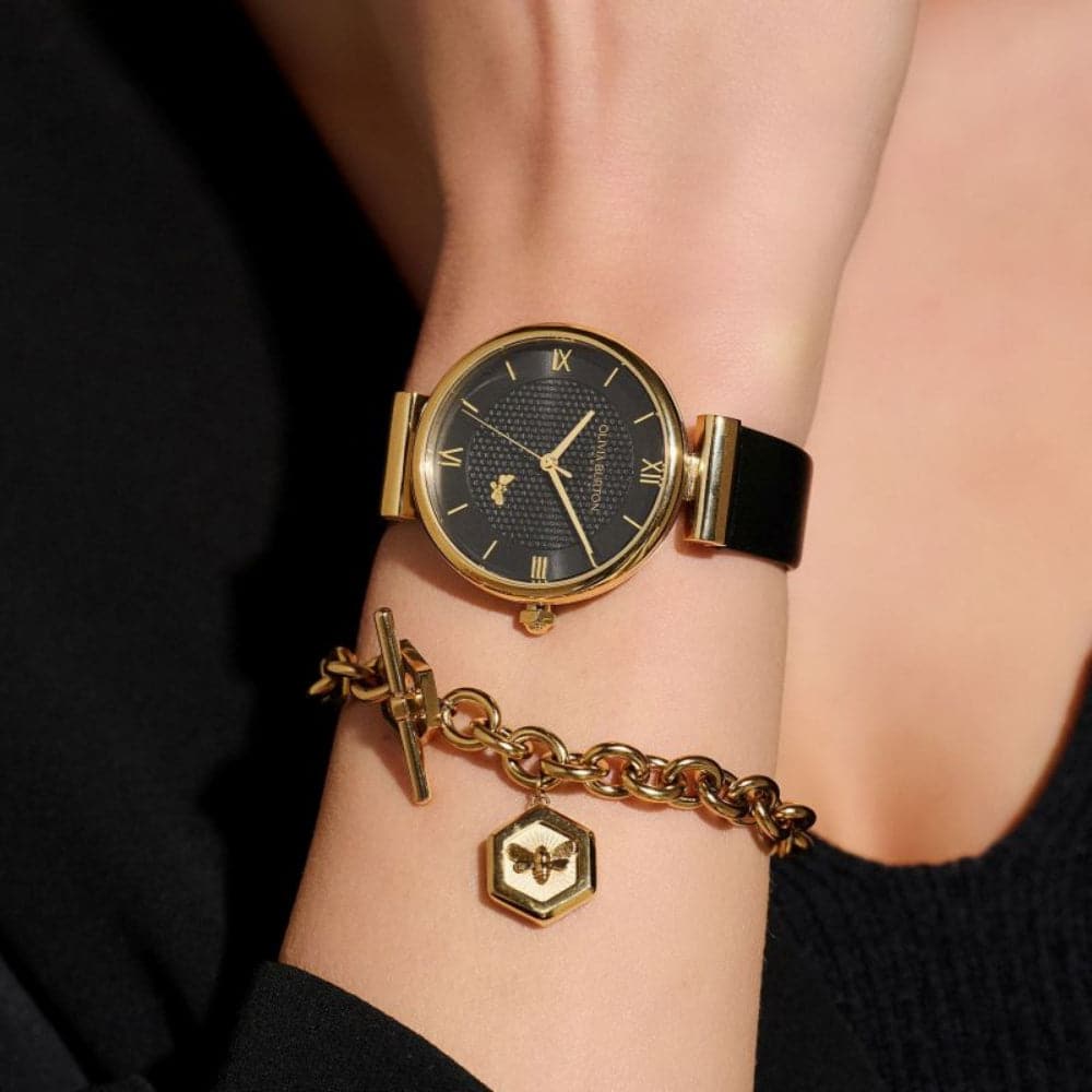 Elegant, refined and extremely stylish, the Minima Bee watch joins our Signature range. Spot the intricate honeycomb design on a moody black dial, perfectly finished with a tiny bee motif and contrast markers in gold. The black leather strap and sculpted gold-plated case give a contemporary feel to a new favorite. Btw, this looks incredible under twinkling lights as an evening look.