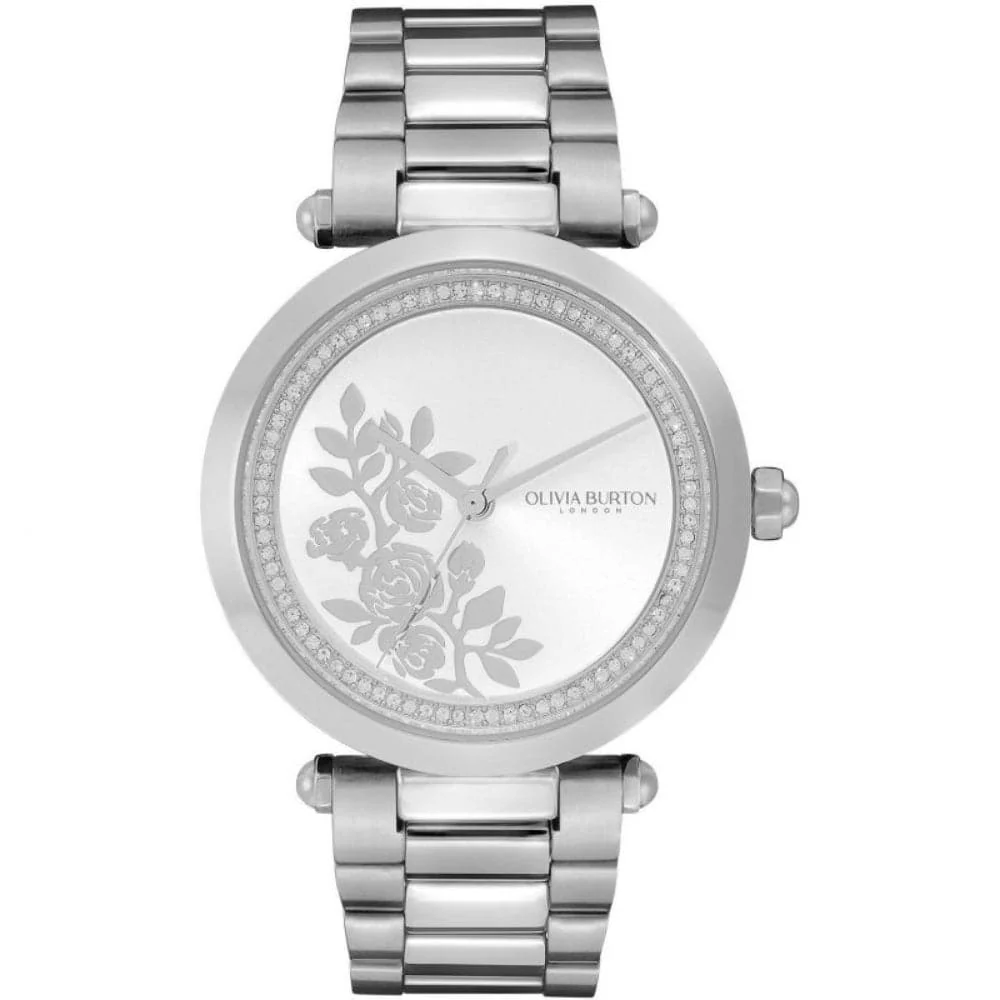 Olivia Burton Signature T-Bar Floral Watch. Featuring a 34mm Stainless Steel Applied Floral Sunray Dial with Crystal Details and Stainless-Steel Link Bracelet.