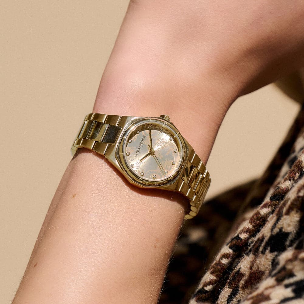 Introducing sports luxe like you’ve never seen it before. The Mini Hexa watch is the latest addition to our Sports Luxe collection and fuses pretty and sporty in one effortless design. A detailed floral print inspired by classic English interiors adorns a gold 28mm dial studded with crystal markers. The gold-plated integrated bracelet strap and modern case give a classic, sporty feel to feminine details. It’s chic-meets-sport and you’re not going to want to take it off.