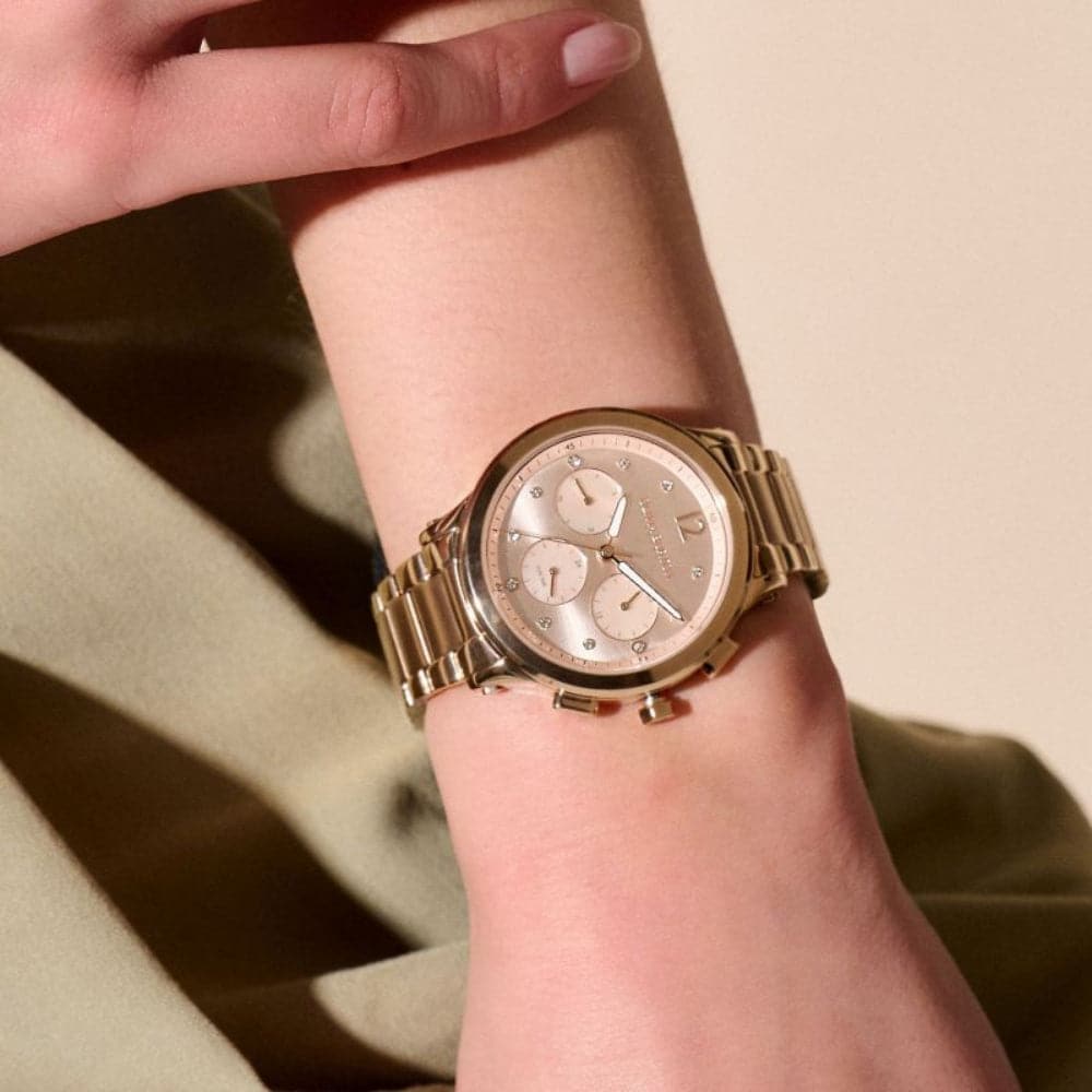 Olivia Burton Sports Luxe Multifunction Watch. Featuring a 38mm Carnation Gold Multifunction Pale Blush Dial, Pale Blush Mother of Pearl Eyes and Carnation Gold Link Bracelet.