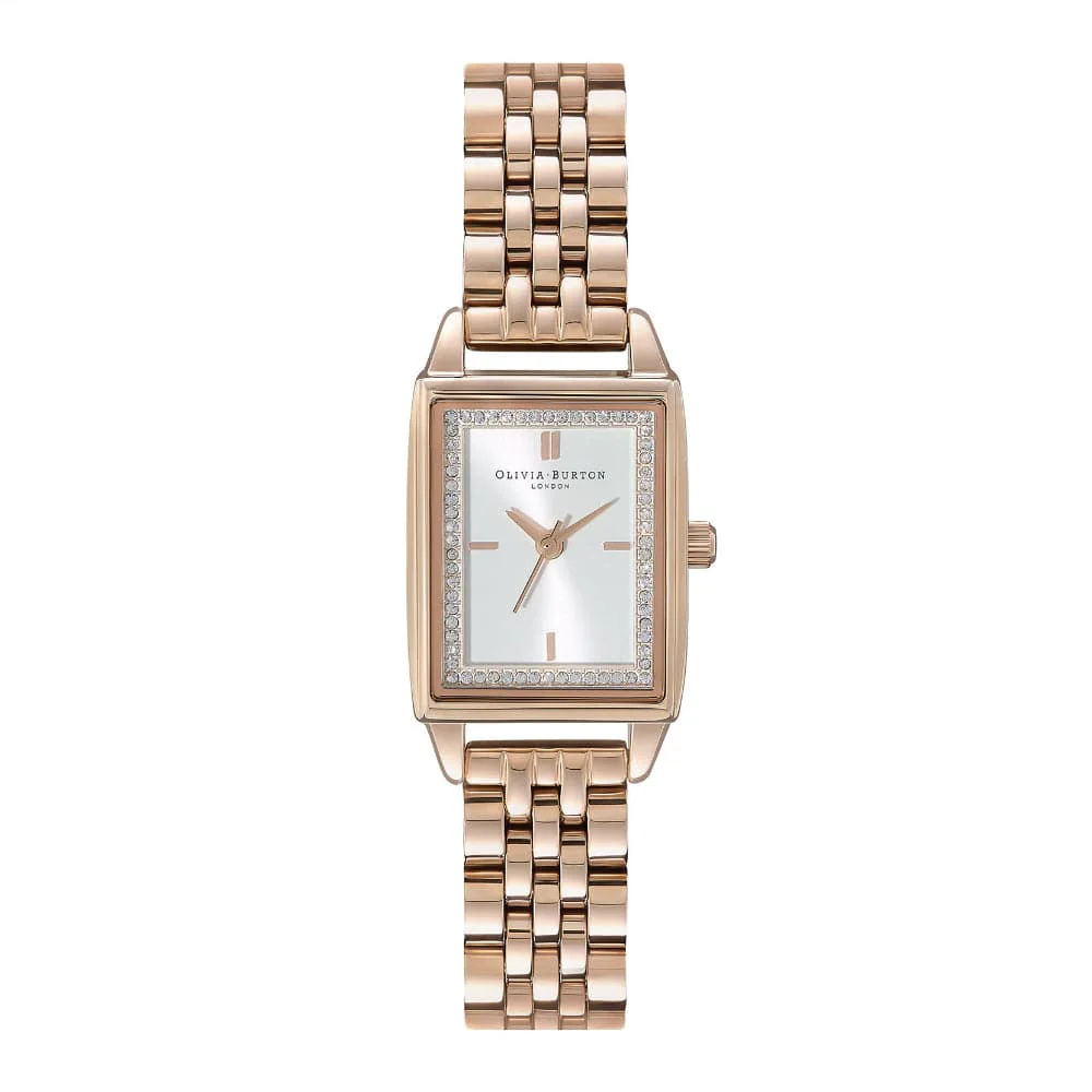 Styled after the traditional London townhouse, this rectangular-shaped case evokes the same timeless and refined appeal of its namesake. Symmetry and minimalism at its core, the powder white dial is paved with crystals and complete with etched markers. Finished with a sleek carnation gold bracelet strap for a contemporary yet classic aesthetic.
