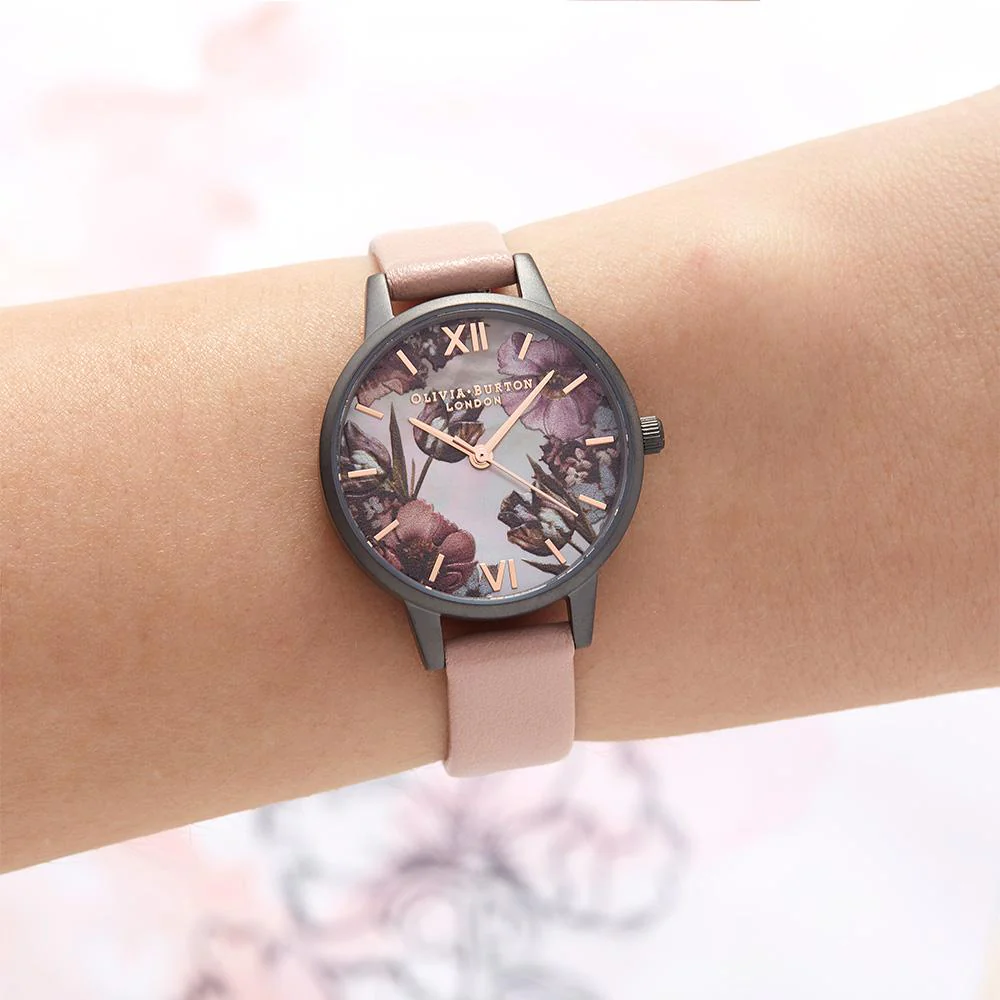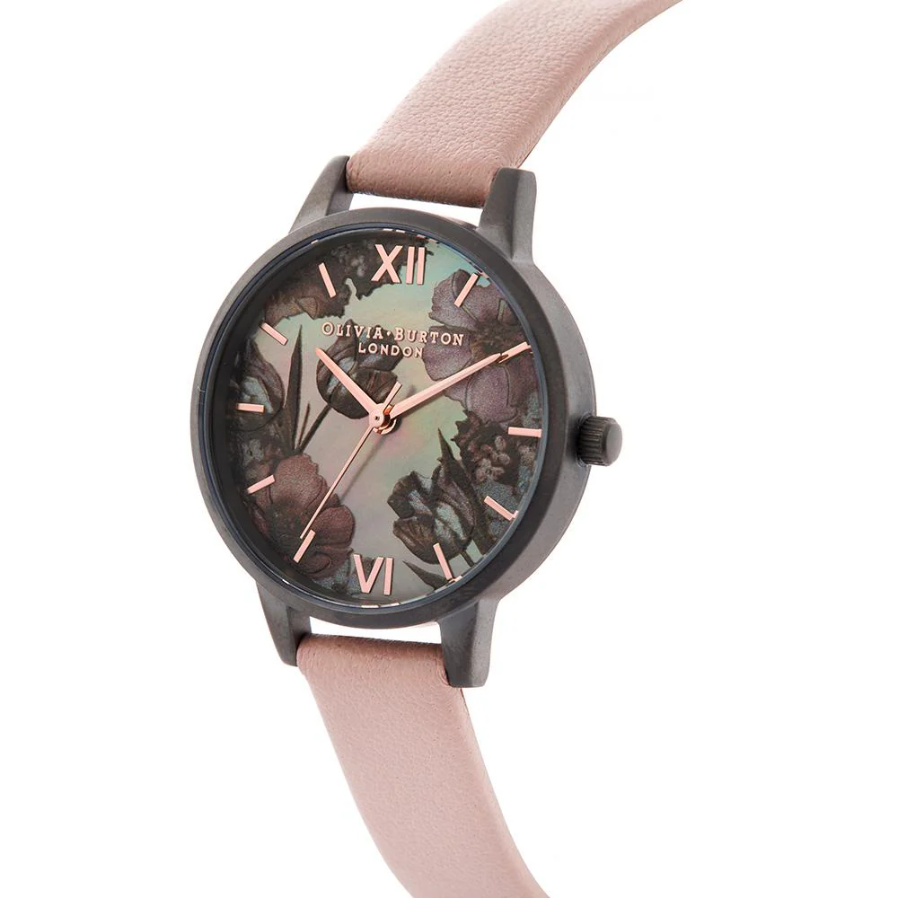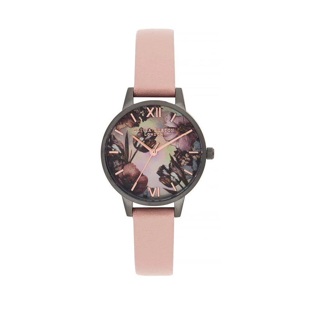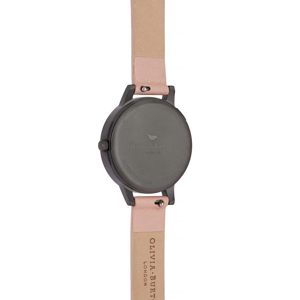 The dusty pink strap highlights the 30 mm gunmetal case, making this watch a perfect fit for casual party evenings or work wear.