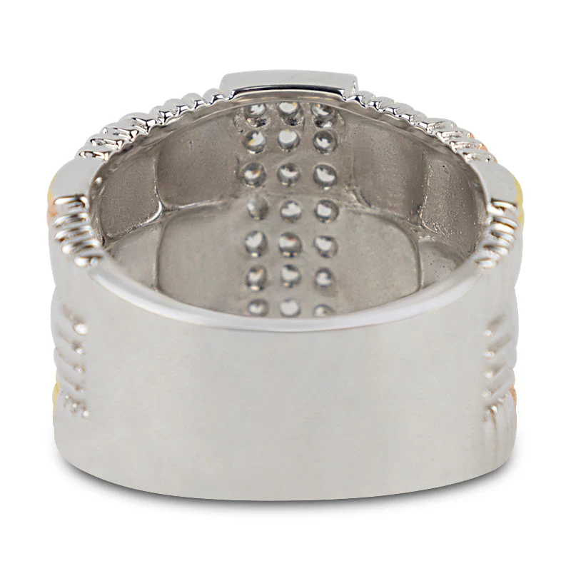 Discover the bold and intricate style of the Olivia Tritone Weave Band Ring 20-6780, an exquisite statement piece for any jewellery lover. This ring showcases a beautiful woven design that artfully combines the warm tones of silver, gold, and rose gold in a repeating ribbed pattern. The result is a rich, textured appearance that is both modern and sophisticated.