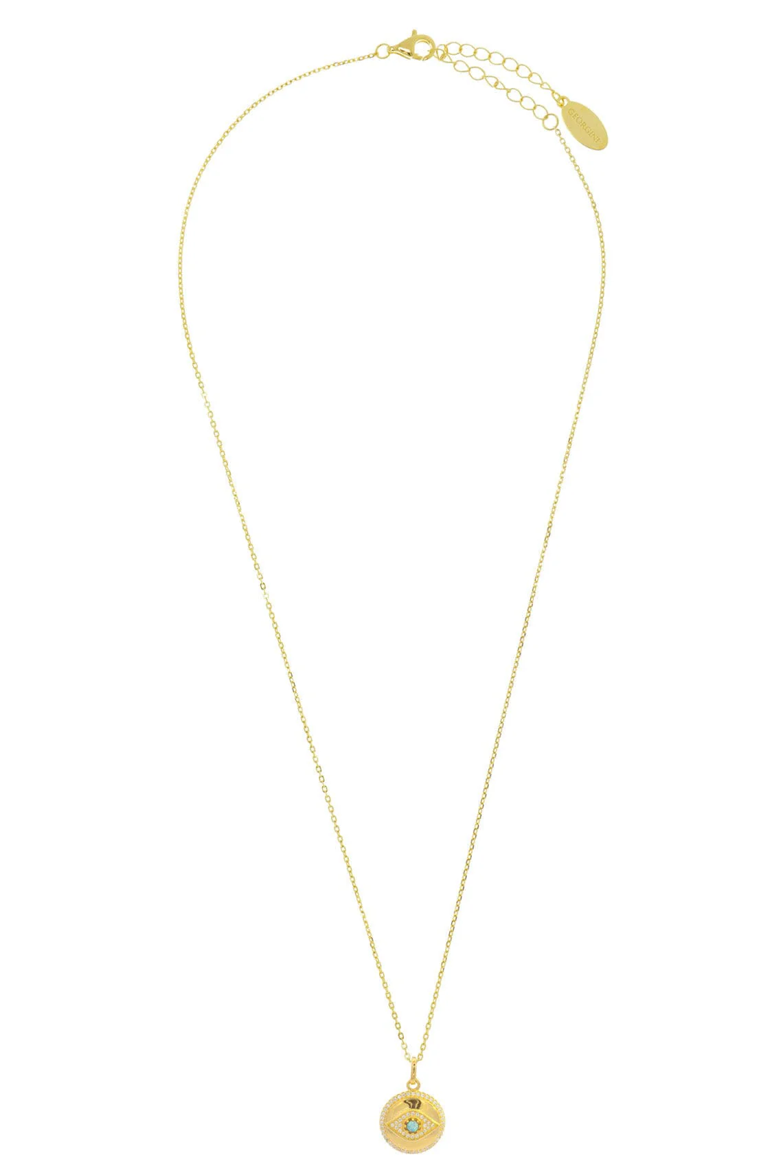 The Evil Eye symbol is a timeless charm for protection, believed to safeguard the wearer from misfortune while bringing peace and good fortune. Georginis Evil Eye Medallion features a created blue opal eye, surrounded by sparkling cubic zirconia. The medallion measures approximately 15mm wide and is paired with a 41cm chain, plus a 4 cm extension. Both the pendant and chain are crafted from 18k gold E-coated 925 sterling silver, offering durability and shine.