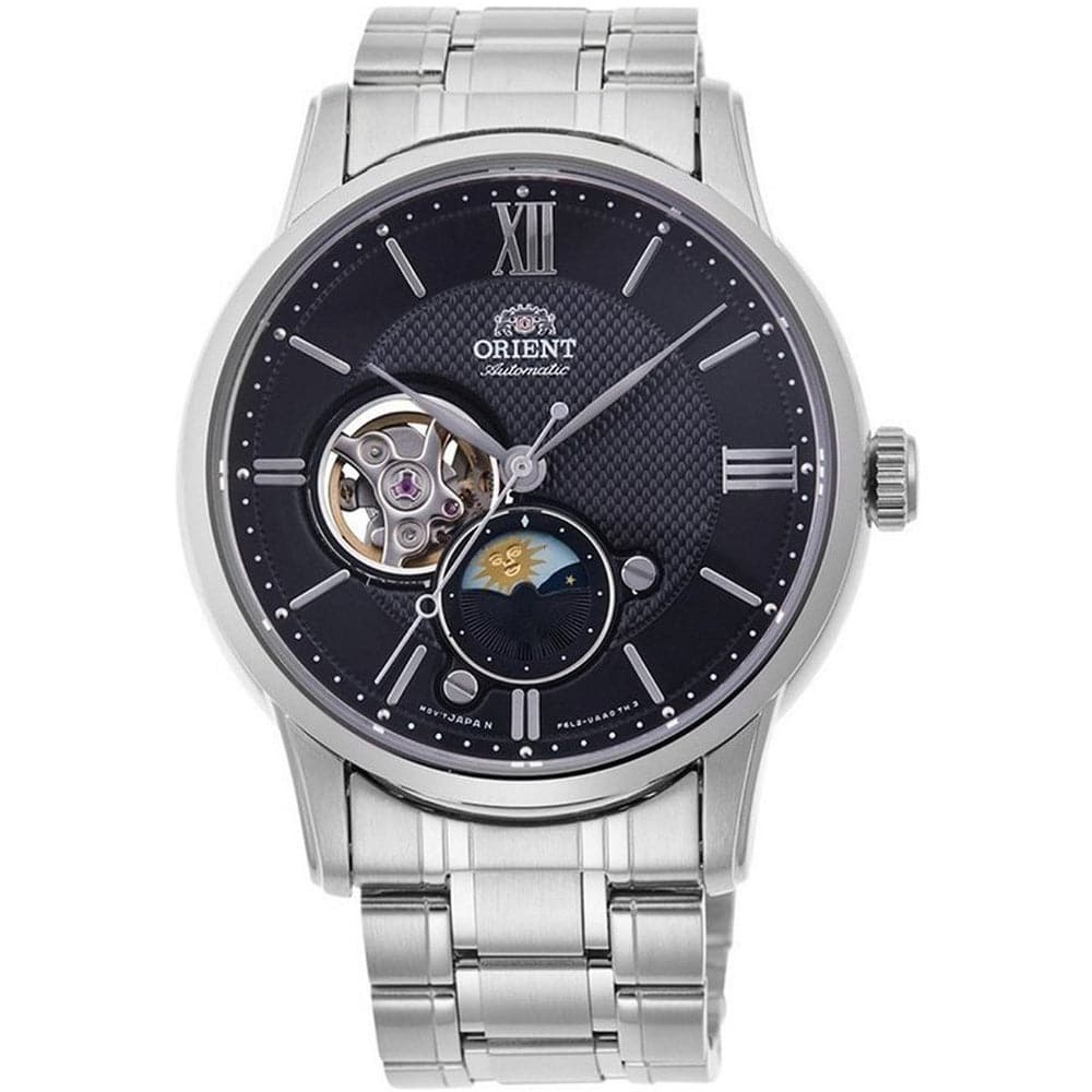 At the heart of this timepiece is an automatic movement that, as is usual for Orient watches, guarantees precise timekeeping and provides the following functions: minute, moon phase, second, hour.