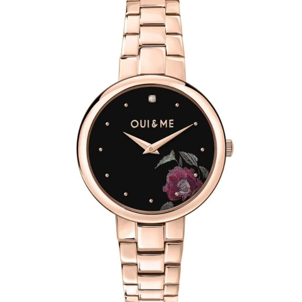 Oui&me women’s time only watch from the chérie collection. Watch made of recycled steel and rose gold pvd. Watch with 34x34mm case. The water resistance is 5 atm.