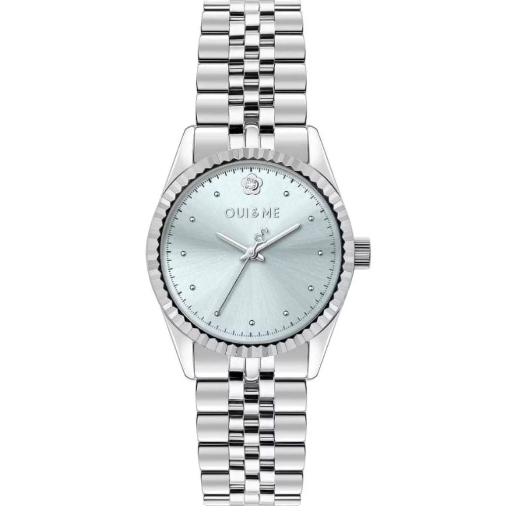 Women’s time only watch by oui & me. Steel watch, natural diamonds selected h / i with steel case with polished finish of 30mm diameter with mineral glass. Silver color metal bracelet with push button deployment closure. The resistance to water is 5 atm.