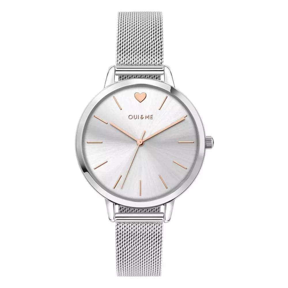 Ladies watch Oui & Me collection Great Amourette ref. ME010022. 38mm steel case, 8.35mm thick. Silver dial with pink gold Pvd hands and indexes. Mesh steel bracelet (Milanese mesh) with clip closure. Waterproof up to 5 atm.