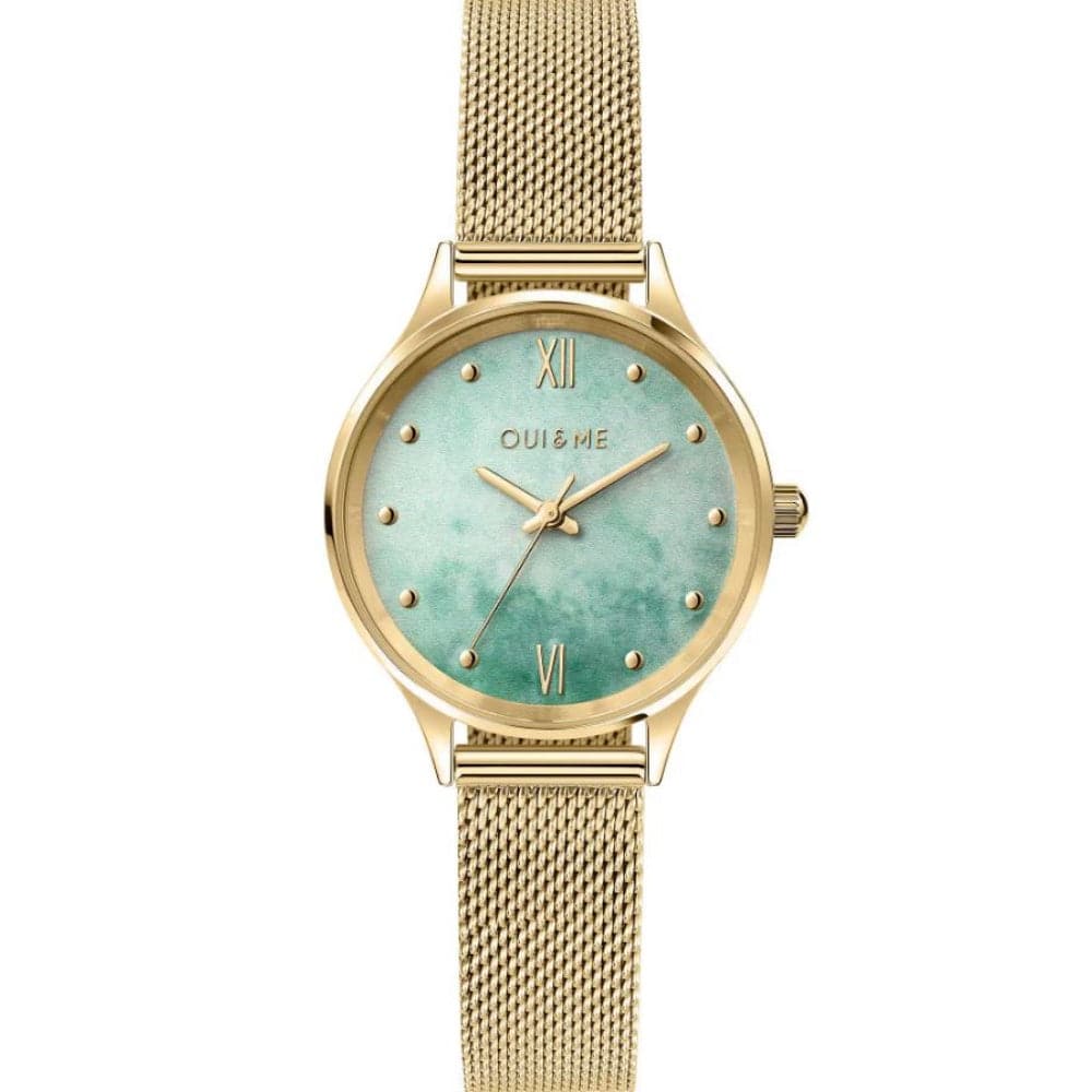 Oui&Me women’s time only watch. Steel watch, gold pvd with 28mm diameter steel case with polished finish with mineral glass. Gold-colored metal bracelet with clip and hook closure. The water resistance is 5 atm.