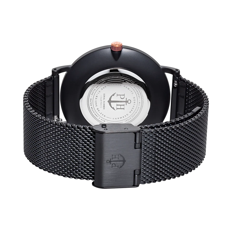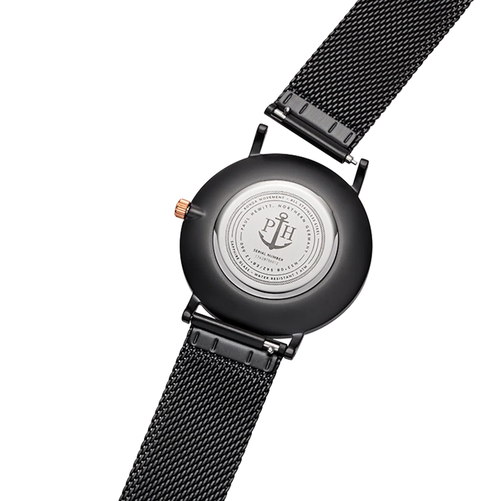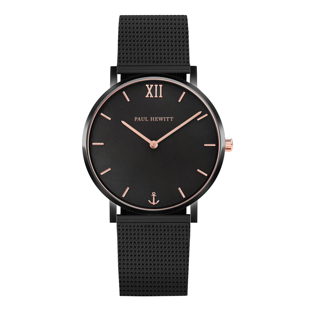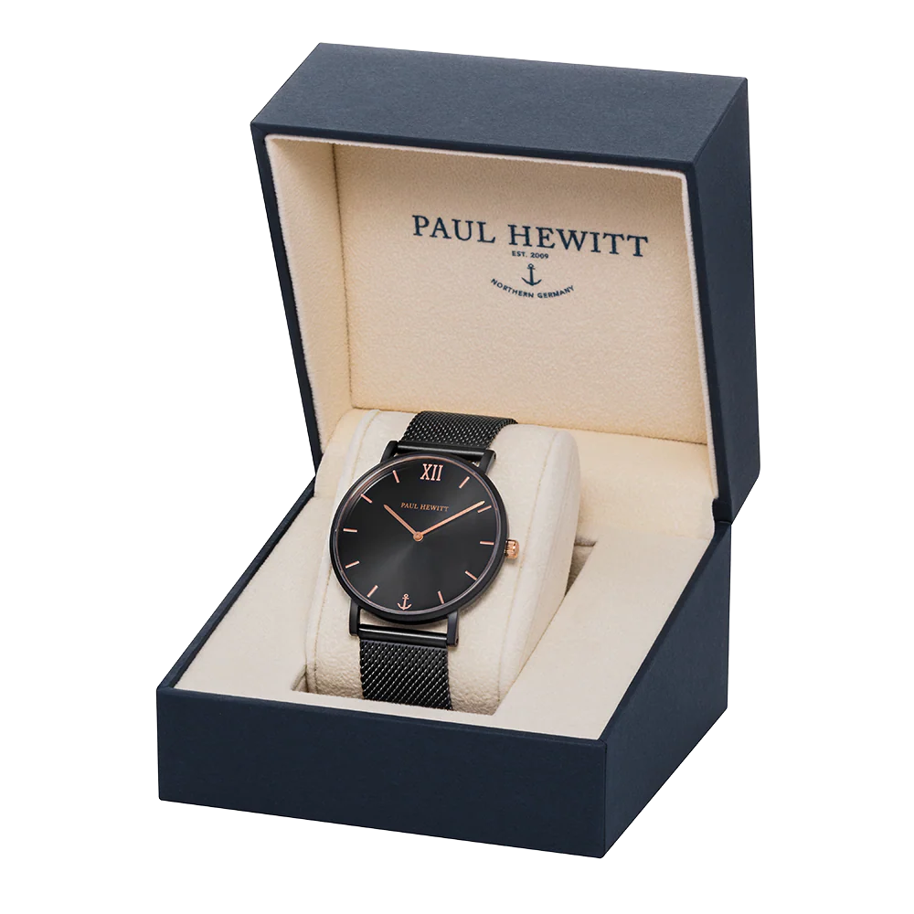Refined and understated, the Paul Hewitt Sailor Black Sunray women’s watch blends minimalist design with luxurious craftsmanship. Featuring a 39 mm black ion-plated stainless-steel case and a matching fine mesh strap, this timepiece presents a sleek, all-black silhouette enhanced by subtle rose-gold accents on the dial. The crisp Black Sunray face and anti-scratch sapphire crystal glass ensure both durability and clarity, while the premium RONDA quartz movement guarantees precise timekeeping. Tailored for both daytime elegance and evening sophistication, this stainless-steel watch offers 5 bar water resistance, making it as practical as it is stylish. A standout in the watches category, it’s delivered in an official Paul Hewitt box, elevating its appeal as a timeless accessory or a thoughtful gift.