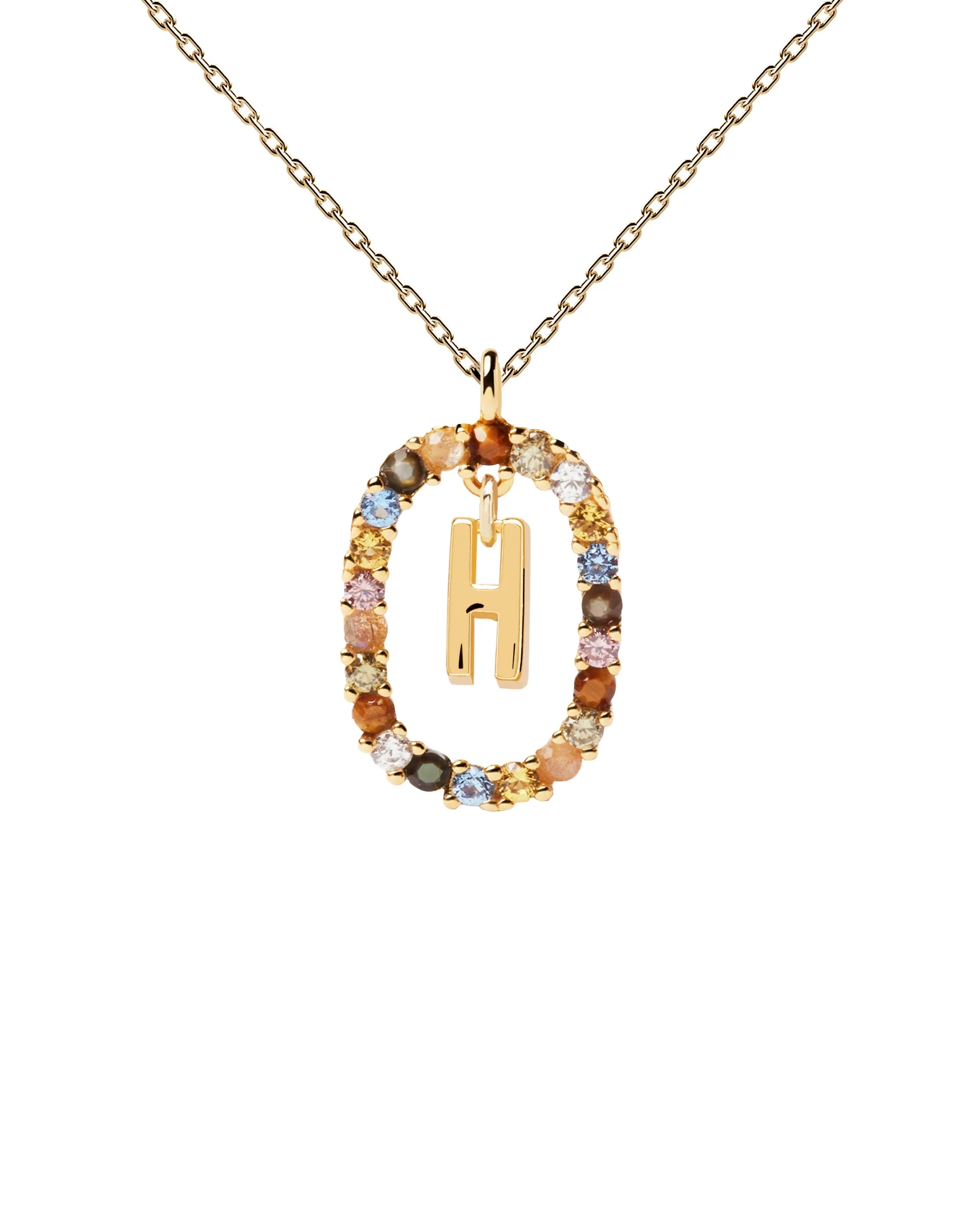 Labradorite, Tiger Eye, Mother of Pearl and crystals blend in a bright squarish oval that saves your initial like a treasure, giving life to a necklace design that will become the timeless icon of your own. Like floating in the air, an 18k gold plated initial hangs inside the amulet, a prominent piece made of 925 silver as your ultimate bold statement. Surrounding color hues and veins in the natural gemstones are singular characteristics in each necklace, making every letter genuinely unique in the world.