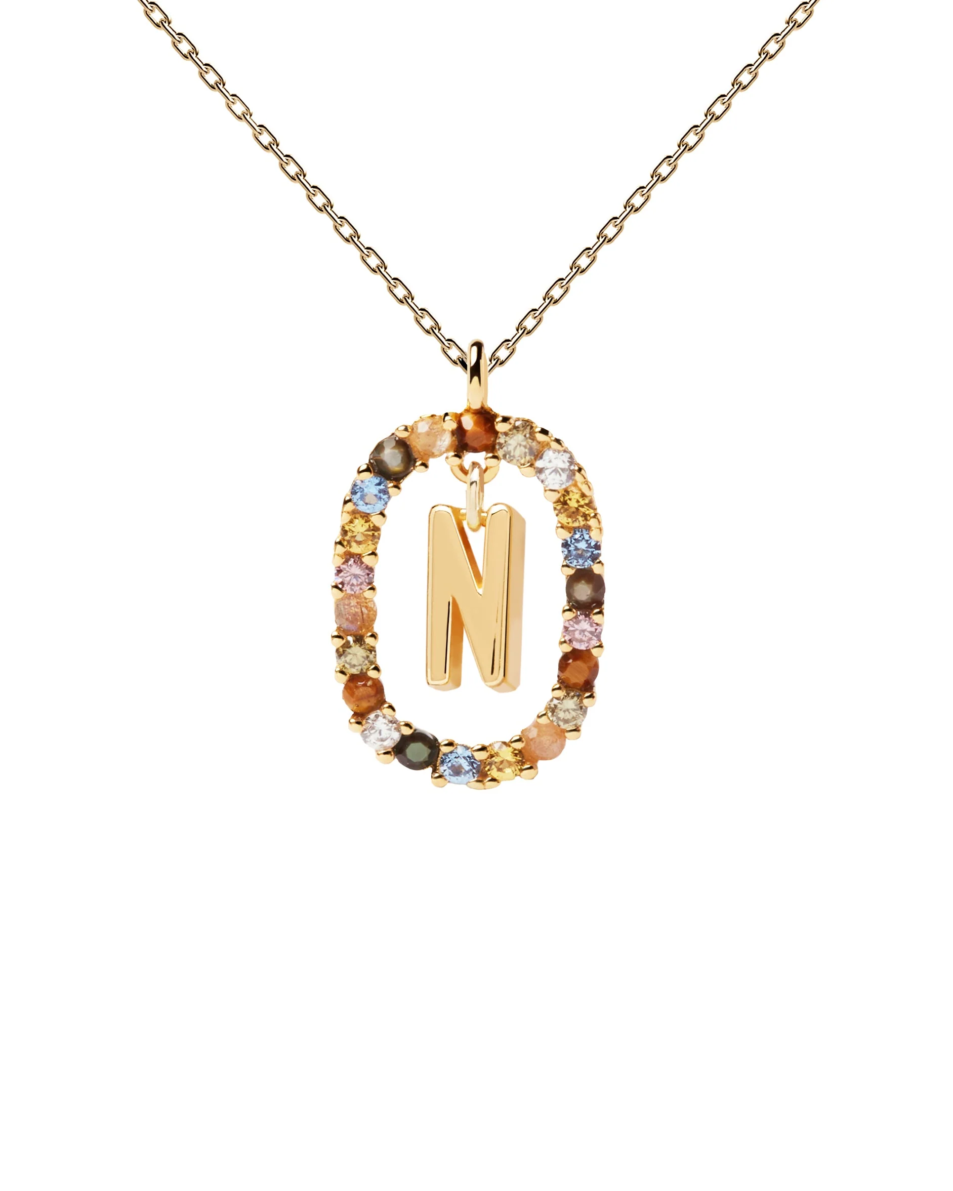 PDPAOLA’s Letter N Necklace embodies modern elegance with timeless craft. Cast in 925 sterling silver and finished with 18k gold plating, the pendant features a floating gold-plated N inside an oval ring set with tiger eye, labradorite, Mother-of-Pearl and crystals. The oval measures 10.5 x 15 mm (1.05 x 1.50 cm); the letter stands 6.5 mm high and 3 mm thick. Stones are 1.5 mm each, delivering a subtle mosaic of colour in every light. The chain is adjustable from 40 to 50 cm and the piece weighs 2.5 g. Gemstones may vary slightly in tone due to their natural origin. This women’s necklace from PDPAOLA elevates everyday elegance.