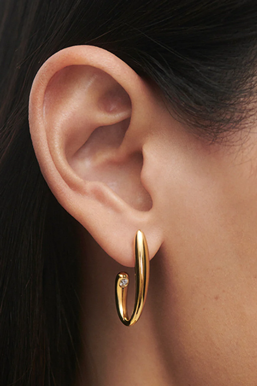 PDPAOLA Volta Hoop Earrings embody modern elegance with a foundation of 925 sterling silver, crafted from recycled silver and finished in radiant 18K gold plating. White zirconia accents catch the light along a sleek, open hoop silhouette. The earrings measure 2.8 cm in height, 0.45 cm wide, and 1.3 cm deep, with a total weight of 7.73 g, offering a balanced, comfortable wear. Designed for timeless appeal, they pair effortlessly with both everyday looks and evening ensembles. A refined choice for women’s jewellery and a subtle nod to sustainable luxury, they embody PDPAOLA’s reputation for craftsmanship and design.