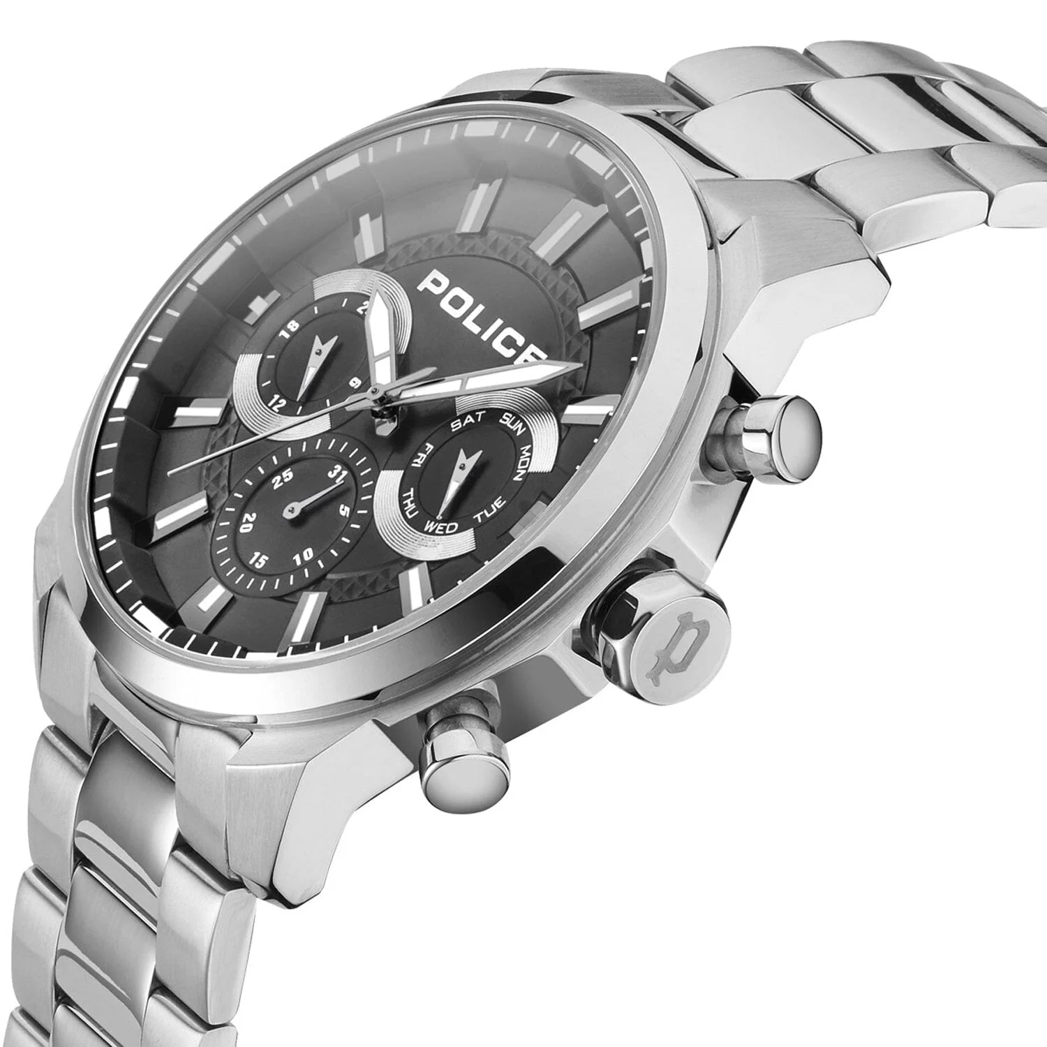 The Police Menelik Chronograph PEWJK2204201 embodies contemporary strength and precision in a bold 46mm stainless steel case with a striking black dial. Designed for the modern man, this quartz men’s watch features multifunction analog sub-dials displaying 24-hour time, day, and date, seamlessly blending utility with style. The silver-tone stainless steel bracelet delivers both durability and a refined finish, secured by a foldover clasp with push-button release for added convenience. Protected by a mineral crystal and water resistant up to 50 meters, this timepiece excels in both design and performance, making it a standout in the men’s watch category.