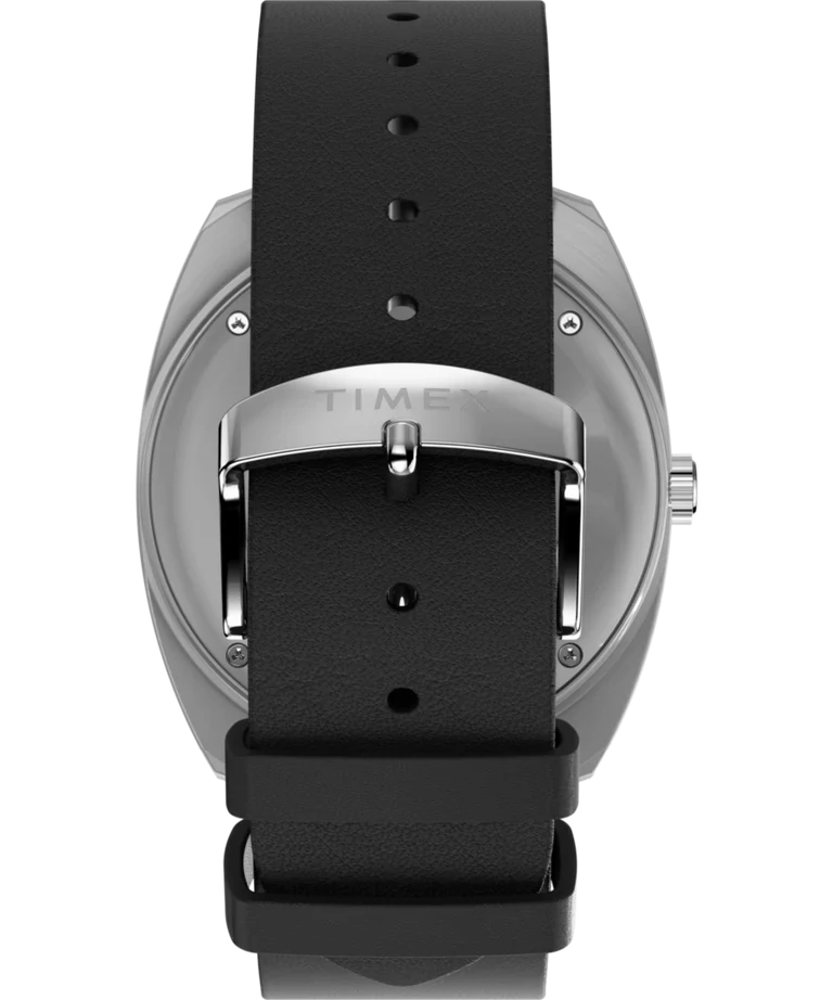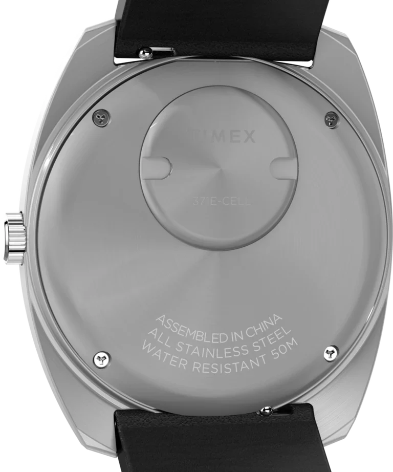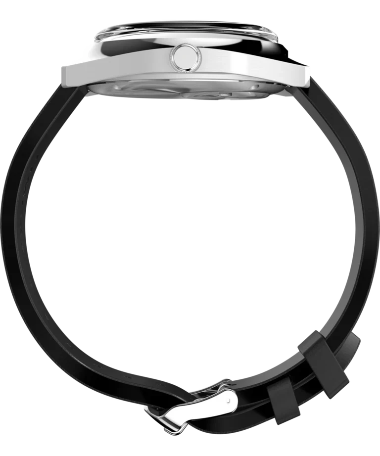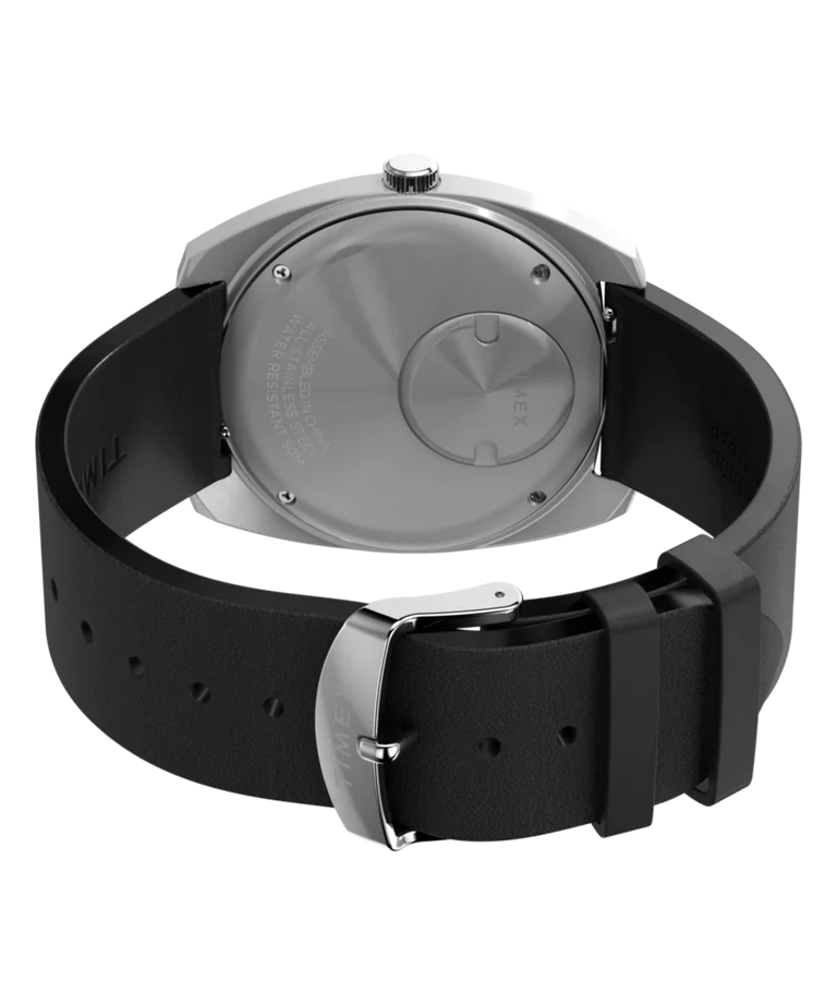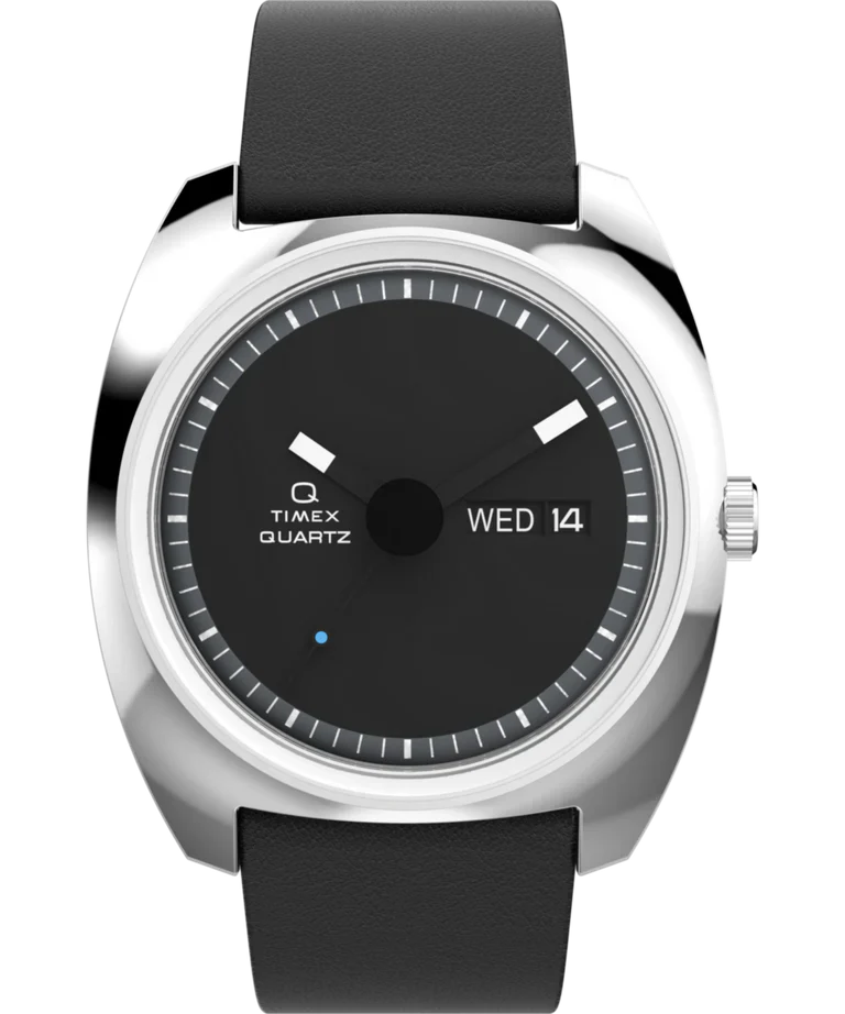 The Q Timex 1975 Enigma Reissue men’s watch captures intrigue with its illusion of floating hands above a crisp black dial, where white and blue accents appear to hover effortlessly. Crafted in a polished 37mm stainless-steel cushion case, it features a domed acrylic crystal that imparts depth to its minimalist design. The precision of quartz movement ensures reliable timekeeping, complemented by a day and date window for practicality. Finished with a supple vegan leather band and quick-release spring bars, this exceptional timepiece delivers both contemporary elegance and the renowned quality of Timex, making it an ideal statement for those who appreciate refined craftsmanship in their jewelry and watch collection.