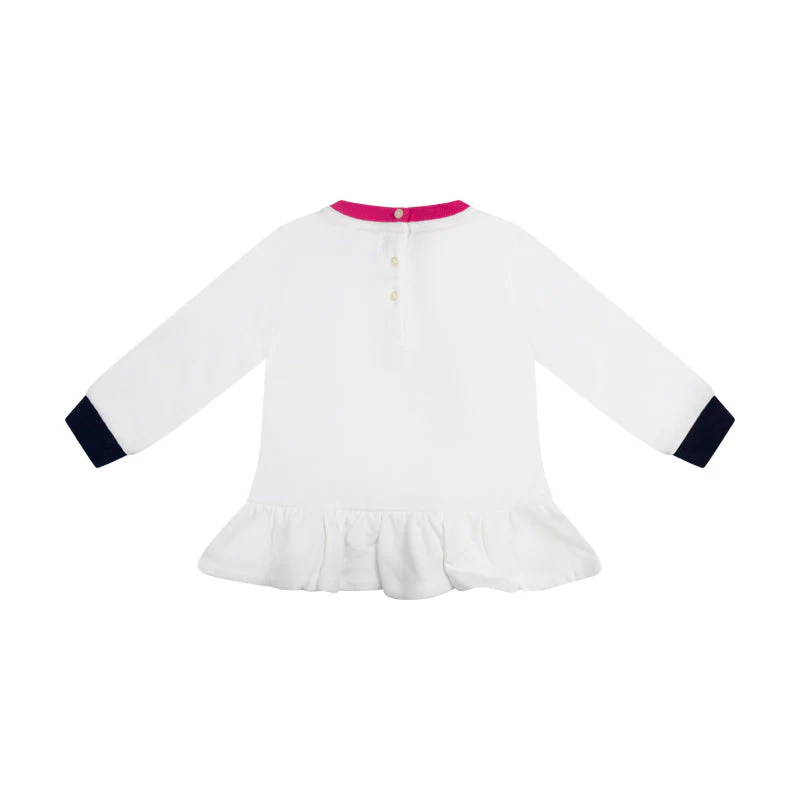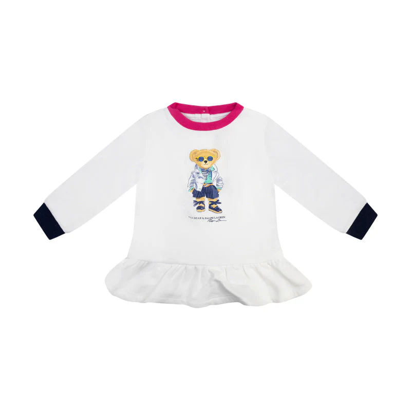 Delight your little one with the Ralph Lauren Polo Bear Fleece Sweatshirt and Leggings Set, the perfect blend of comfort and iconic style for baby girls. Crafted from soft cotton, this charming set features a whimsical white sweatshirt adorned with the celebrated Polo Bear and the iconic Ralph Lauren logo print. The sweatshirt is designed with a cosy pink ribbed neckline and navy blue ribbed cuffs, ensuring both warmth and style, and fastens with buttons at the back for easy dressing.