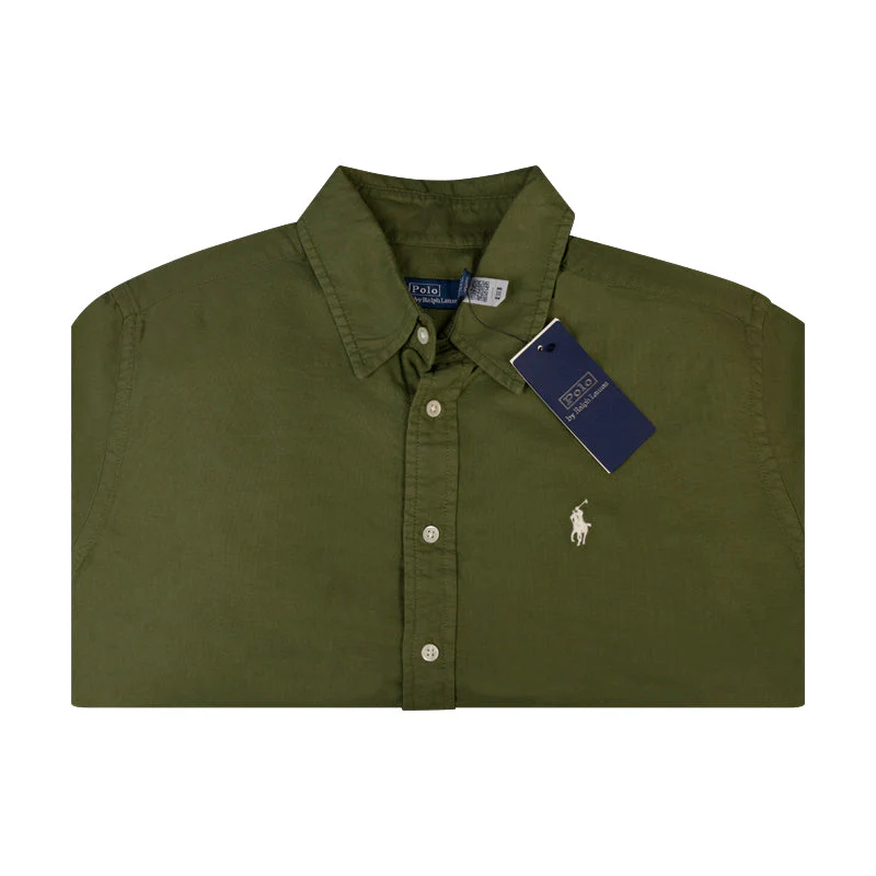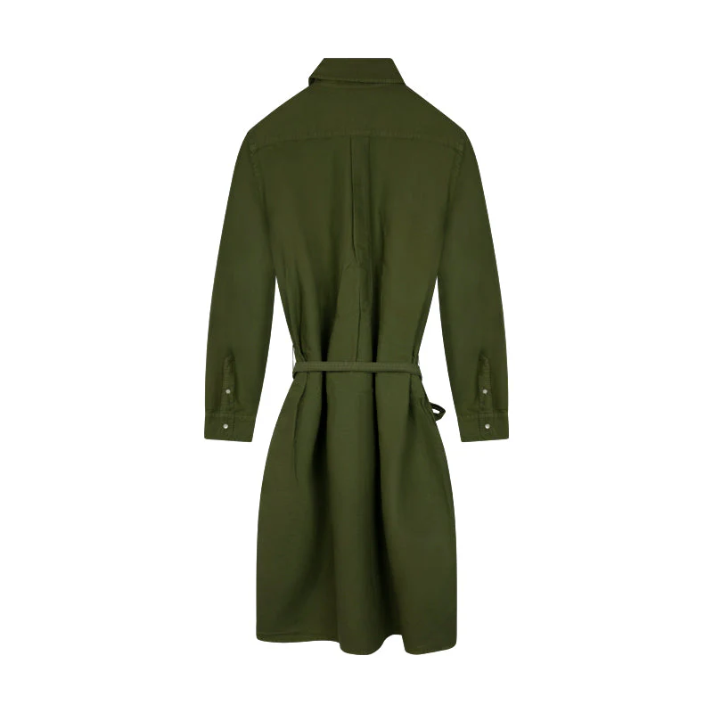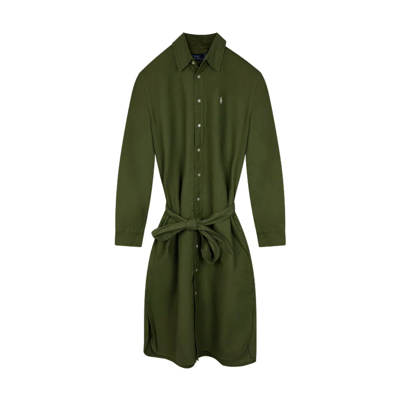 The rich olive green hue, adorned with the iconic signature Polo Pony motif, adds a touch of classic charm. An embroidered logo proudly sits at the chest, making a subtle yet stylish statement. The classic collar and front button fastening exude timeless charm, while the belted waist provides a flattering silhouette.