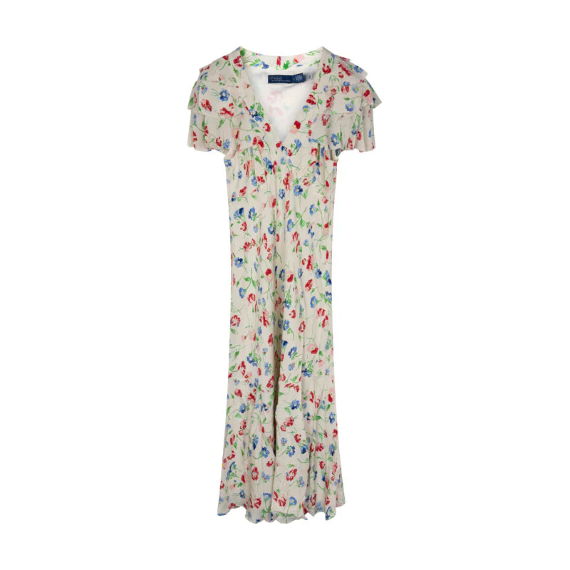 Embrace refined elegance with the Ralph Lauren Polo Floral Silk Crepe Dress, style number 1684 Vintage Daisy. This exquisite A-line dress captures the essence of timeless fashion with its colourful floral print and fluid silk crepe fabric.