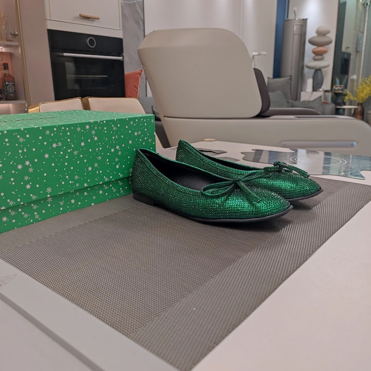 RHINESTONE BALLET FLATS WITH BOW IN FUN GREEN SHEEPSKIN