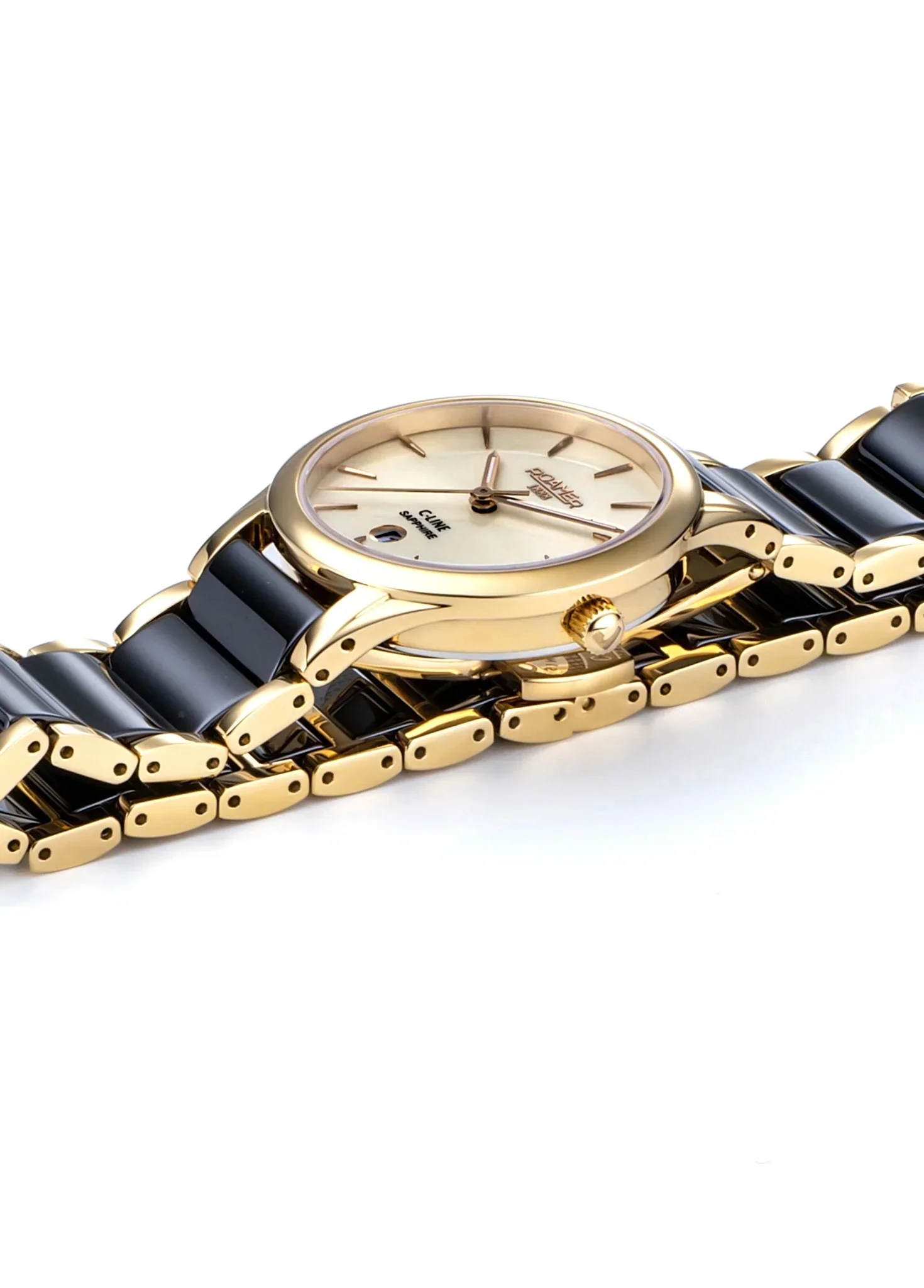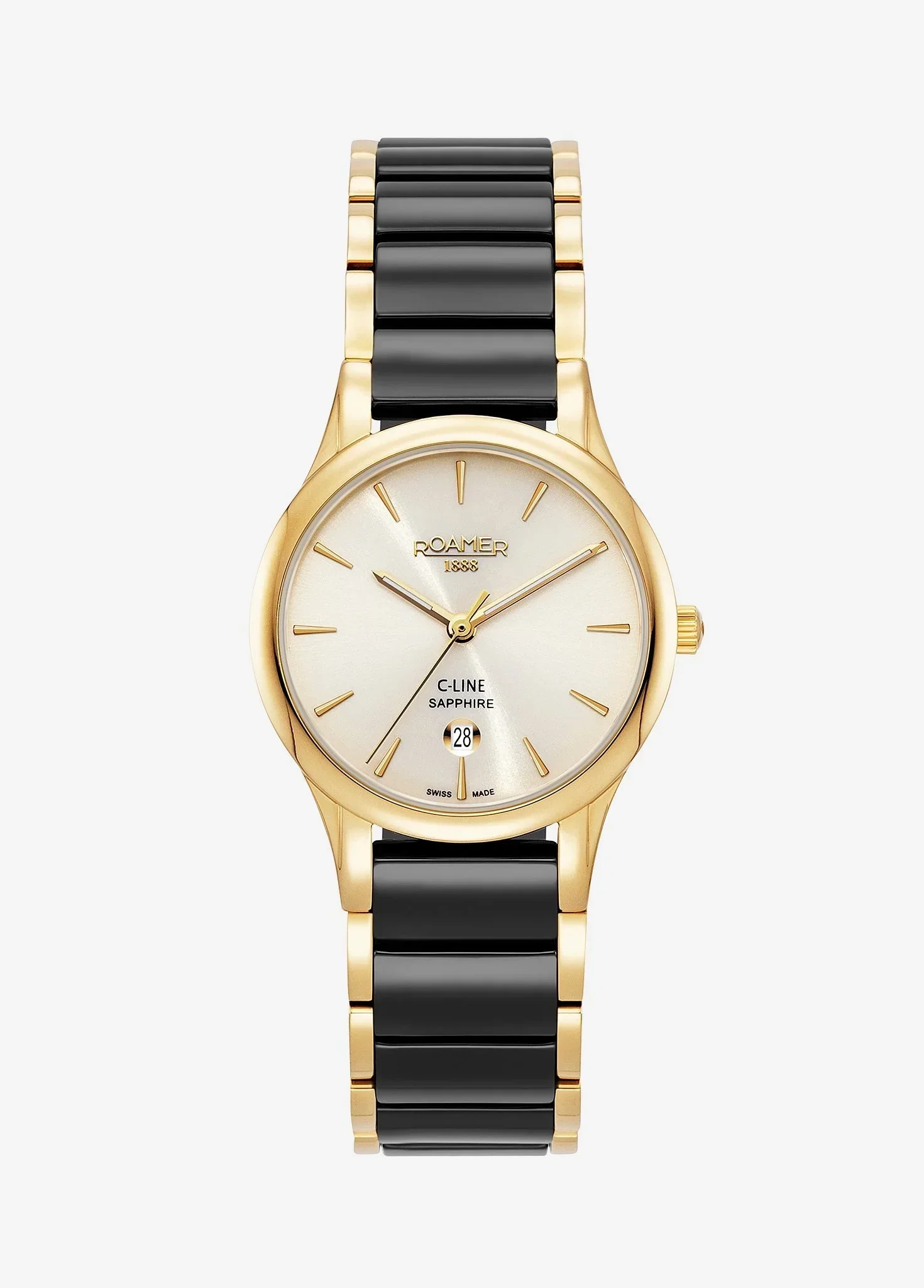 The classic-elegant dress watch impresses with well-balanced design and a sporty bracelet made of scratch-proof, particularly light high-tech ceramic with stainless steel edges. As a subtle counterweight to the date window at the 6 o’clock position, the C-LINE GENTS features a double baton marker at 12 o’clock in addition to the other 11 simple indices. 3 sword-shaped central hands complement the minimalist design of this eclectic timepiece.