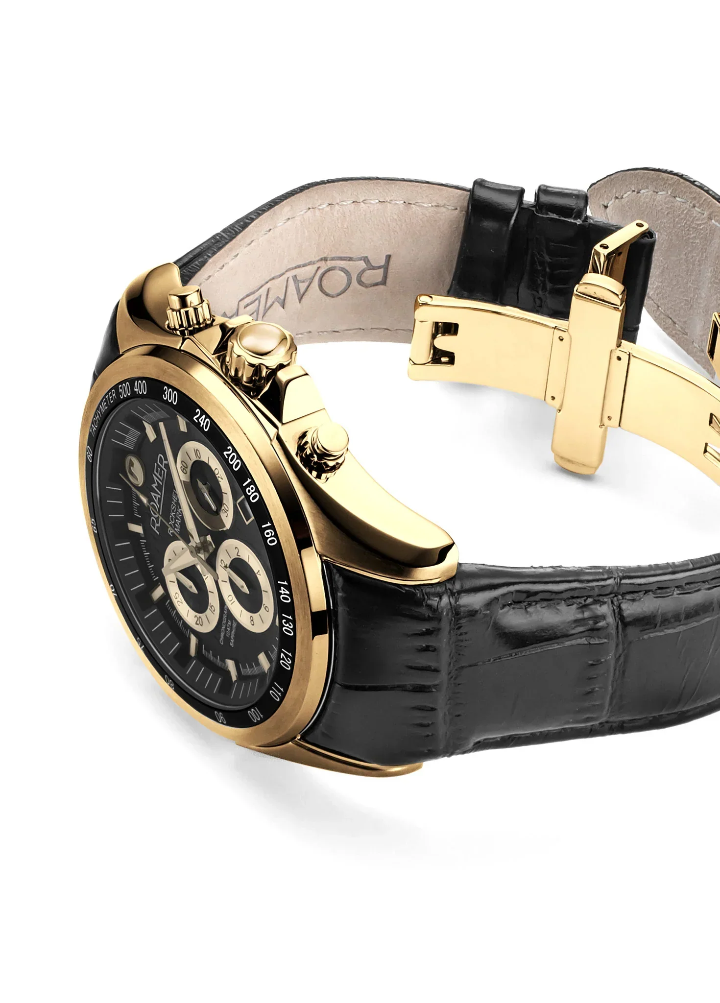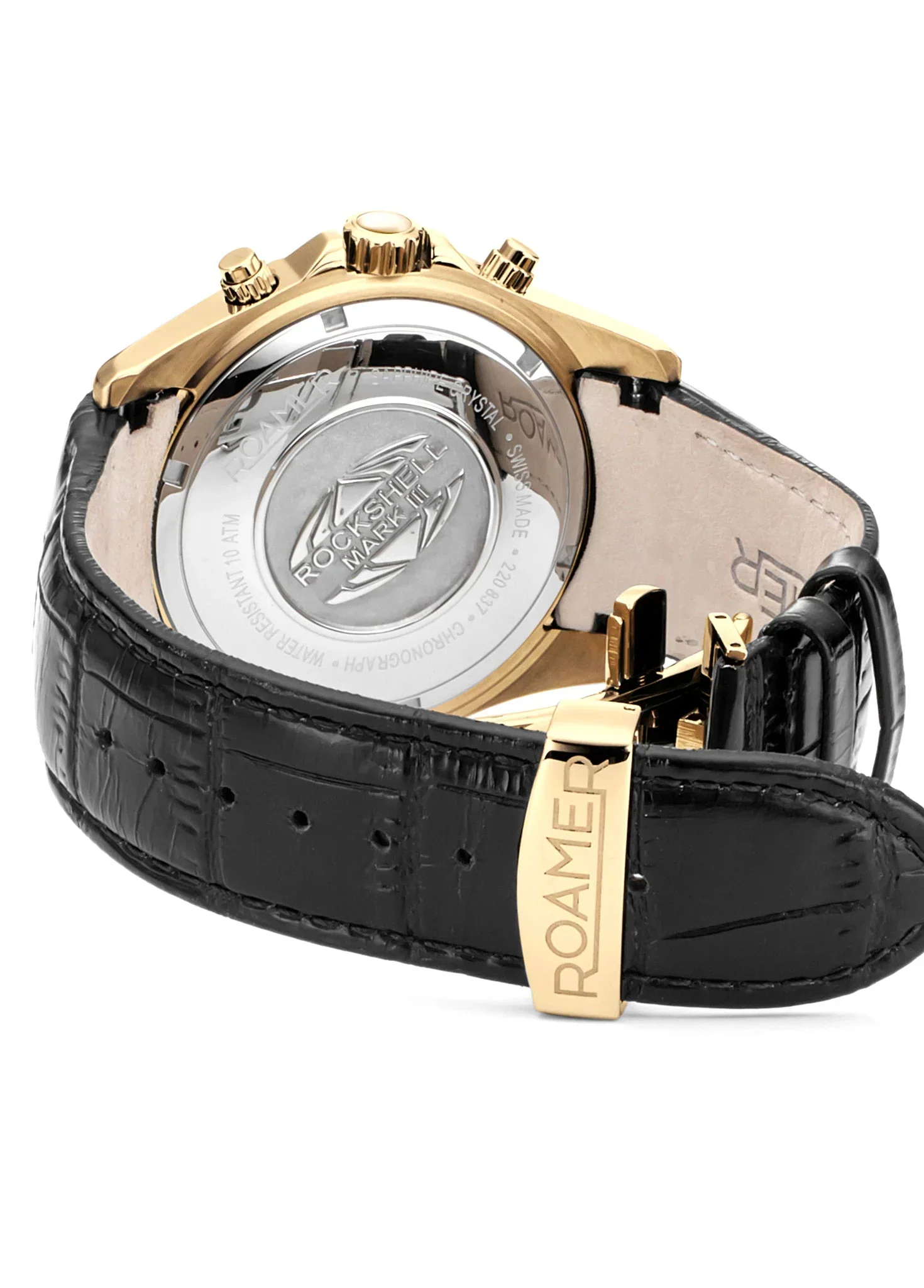 The Roamer Rockshell Mark III Chrono is a bold men’s watch that perfectly balances sporty elegance with Swiss precision. Crafted with a 44mm stainless steel case and finished in a refined gold tone, it features a black dial with a striking pinstripe guilloche, complemented by three subdials and a discreet date window at 4 o’clock. The scratch-resistant sapphire crystal ensures lasting clarity while the black leather strap with butterfly clasp adds luxurious comfort. Powered by a Swiss Made Ronda 5030.D quartz movement and water-resistant to 100 meters, this chronograph is designed for both performance and polished style. A smooth tachymeter bezel and fluted crown complete its distinctive appeal.