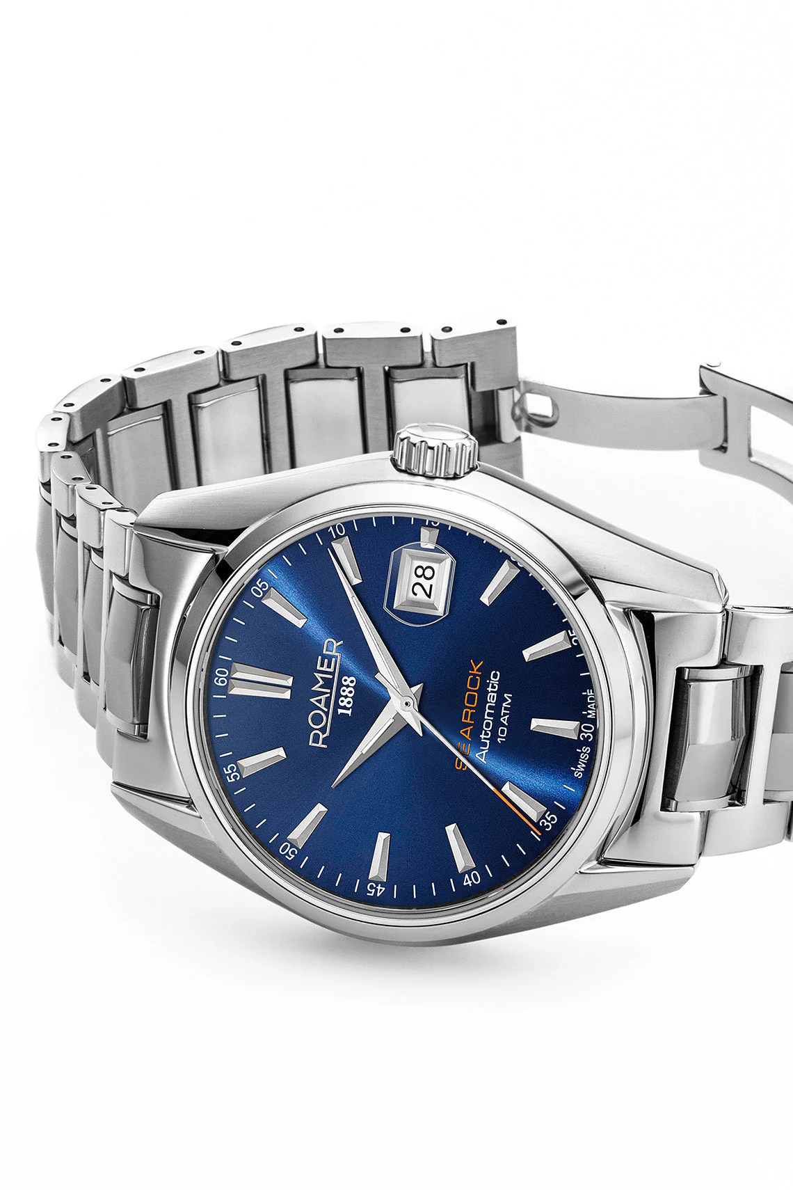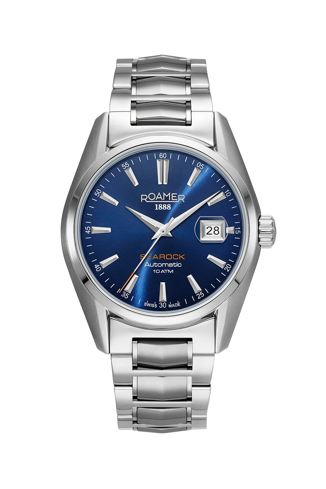 Refined and timeless, the Roamer Searock 42mm Automatic combines classic Swiss craftsmanship with modern elegance. Featuring a striking blue dial housed in a polished silver case, this men’s watch offers an effortlessly sophisticated look suitable for any setting. The stainless steel strap adds durability and a sleek finish, perfectly complementing the bold 42mm silhouette. Powered by a reliable Swiss automatic movement, it delivers smooth precision and enduring performance. Every detail reflects Roamer’s heritage of quality, from the meticulous engineering to the premium materials chosen for lasting style and comfort.