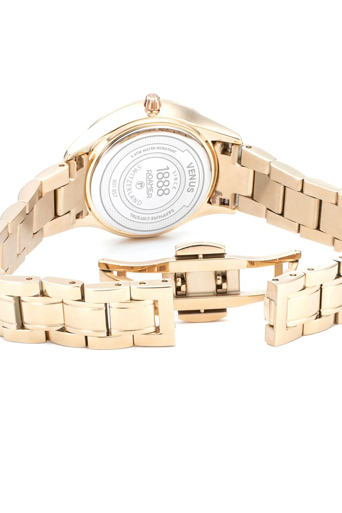 With the VENUS DIAMOND, ROAMER OF SWITZERLAND once again opts for a combination of pure lines and excellent materials, matched with meticulous workmanship and a refined finish. The eye-catching feature on the shimmering mother-of-pearl dial of this enchanting ladies’ watch is the exquisitely cut diamond at 12 o’clock, complemented by 11 delicate, round indices.