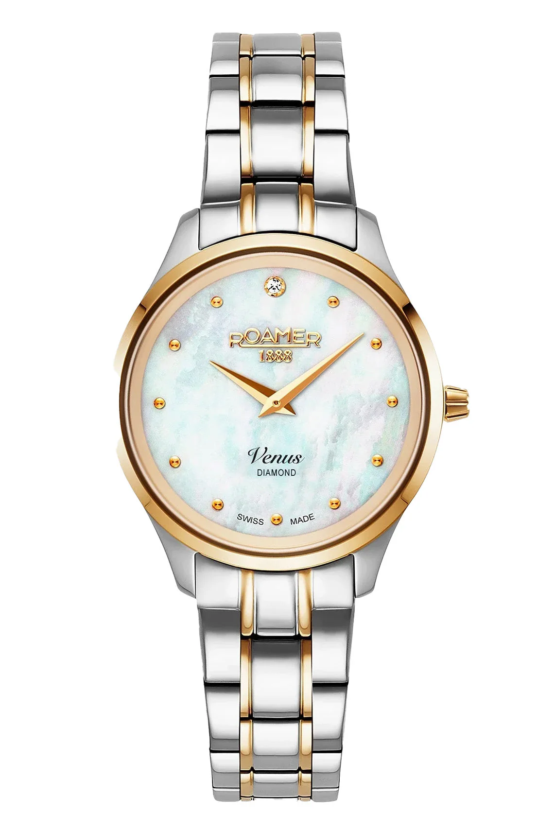 With the VENUS DIAMOND, ROAMER OF SWITZERLAND once again opts for a combination of pure lines and excellent materials, matched with meticulous workmanship and a refined finish. The eye-catching feature on the shimmering mother-of-pearl dial of this enchanting ladies’ watch is the exquisitely cut diamond at 12 o’clock, complemented by 11 delicate, round indices.