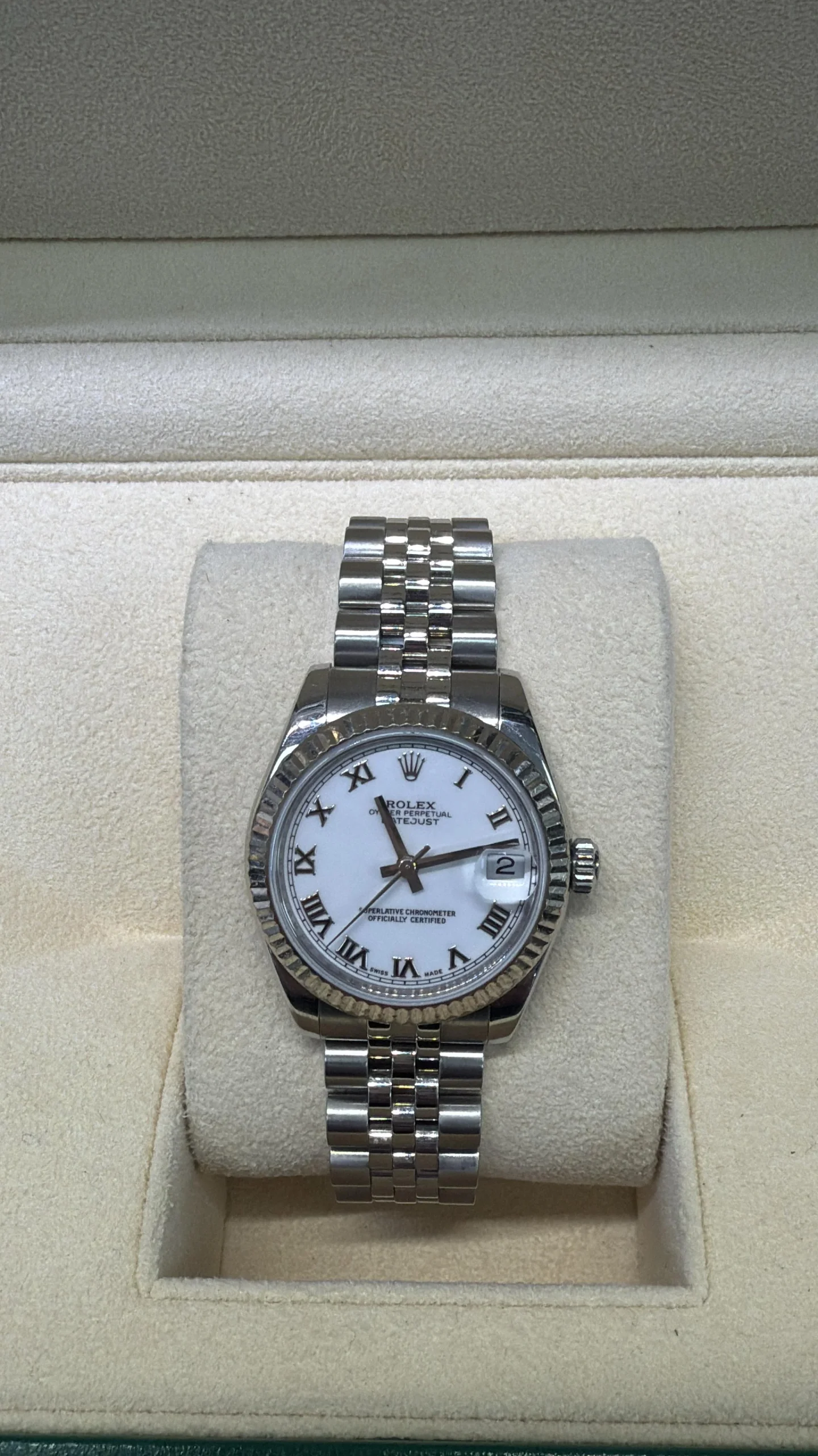 The Rolex Datejust 31mm, model 178274 from 2007, features a striking white dial complemented by a stainless steel case and an elegant gold bezel. Paired with the iconic Jubilee bracelet, this watch offers a refined blend of luxury and durability. Its precise automatic movement ensures reliable timekeeping, making it an excellent choice for those seeking a sophisticated yet versatile timepiece with classic Rolex craftsmanship.