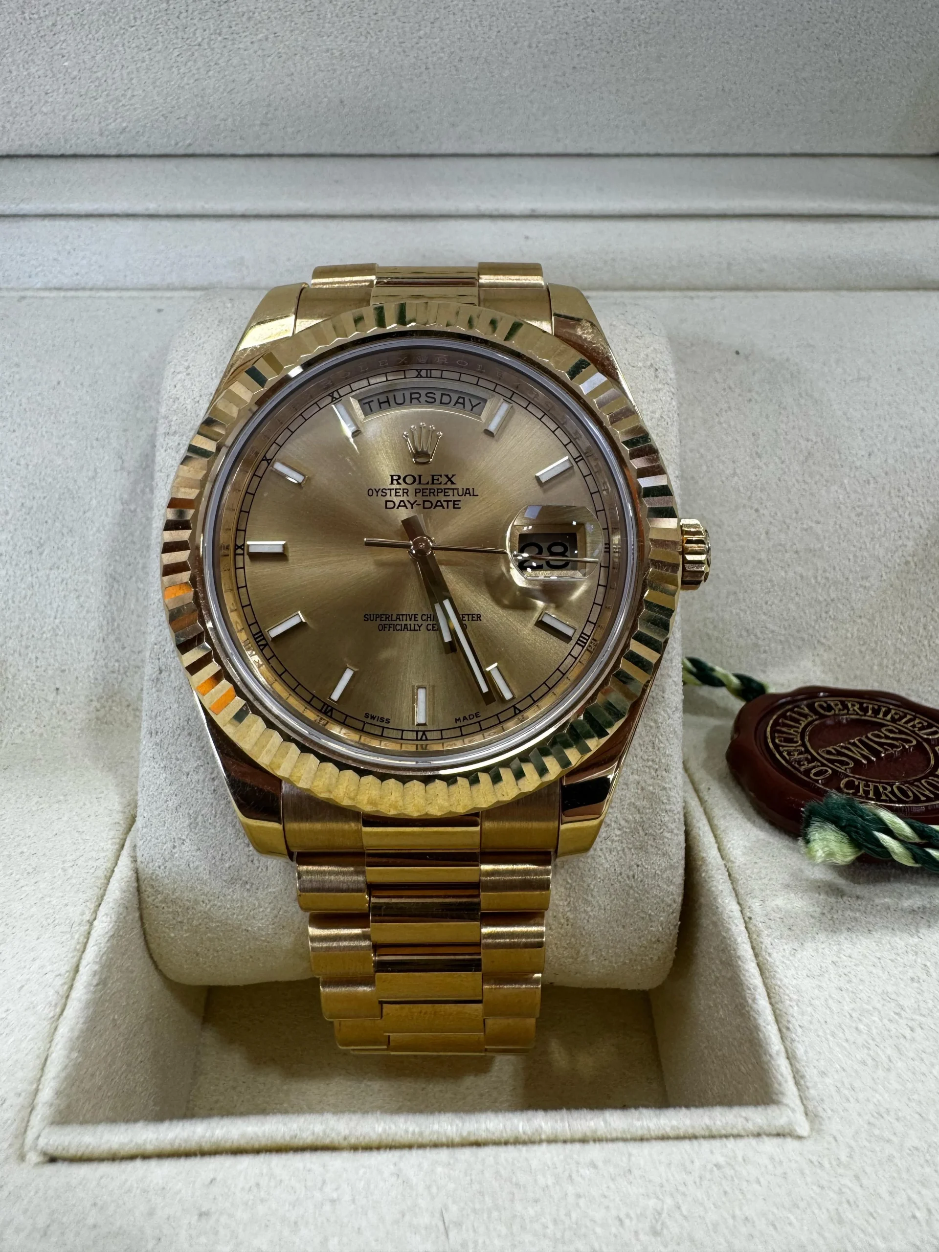 The ROLEX DAY-DATE OYSTER PERPETUAL 41MM – Model No 218238 is a prestigious timepiece from 2014, featuring a full set box and papers. The luxurious and timeless design of the watch makes it a valuable addition to any collection. Perfect for those seeking a statement piece with enduring quality.