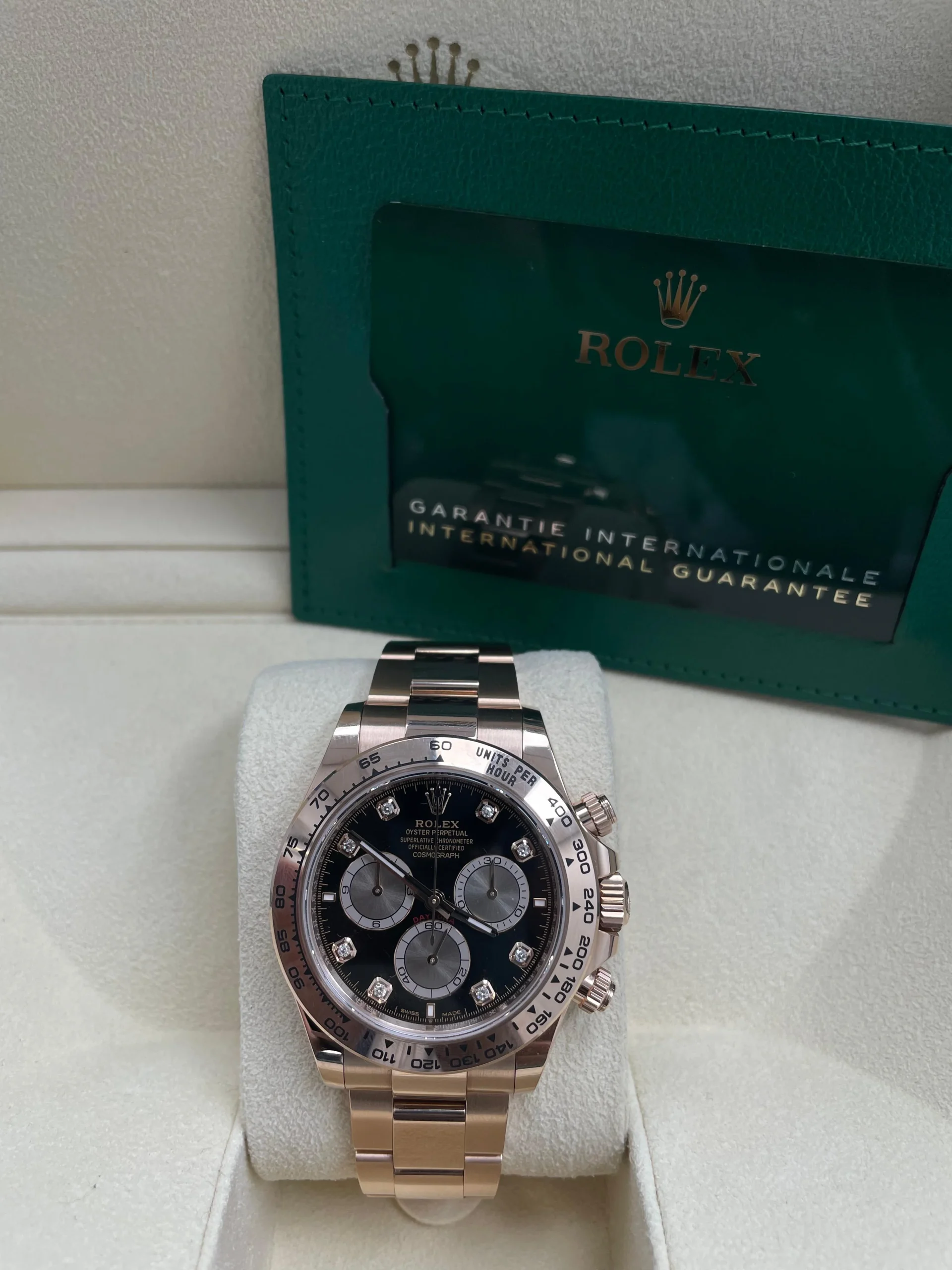 Exquisite Rolex Daytona Cosmograph 126505 crafted in 18K rose gold with a commanding 40mm case. This 2024 model exemplifies horological excellence with its iconic chronograph functionality and distinctive aesthetic. Complete with full box and papers, this timepiece represents the pinnacle of Swiss watchmaking precision, investment value, and unparalleled craftsmanship. A distinguished addition to any serious collection.