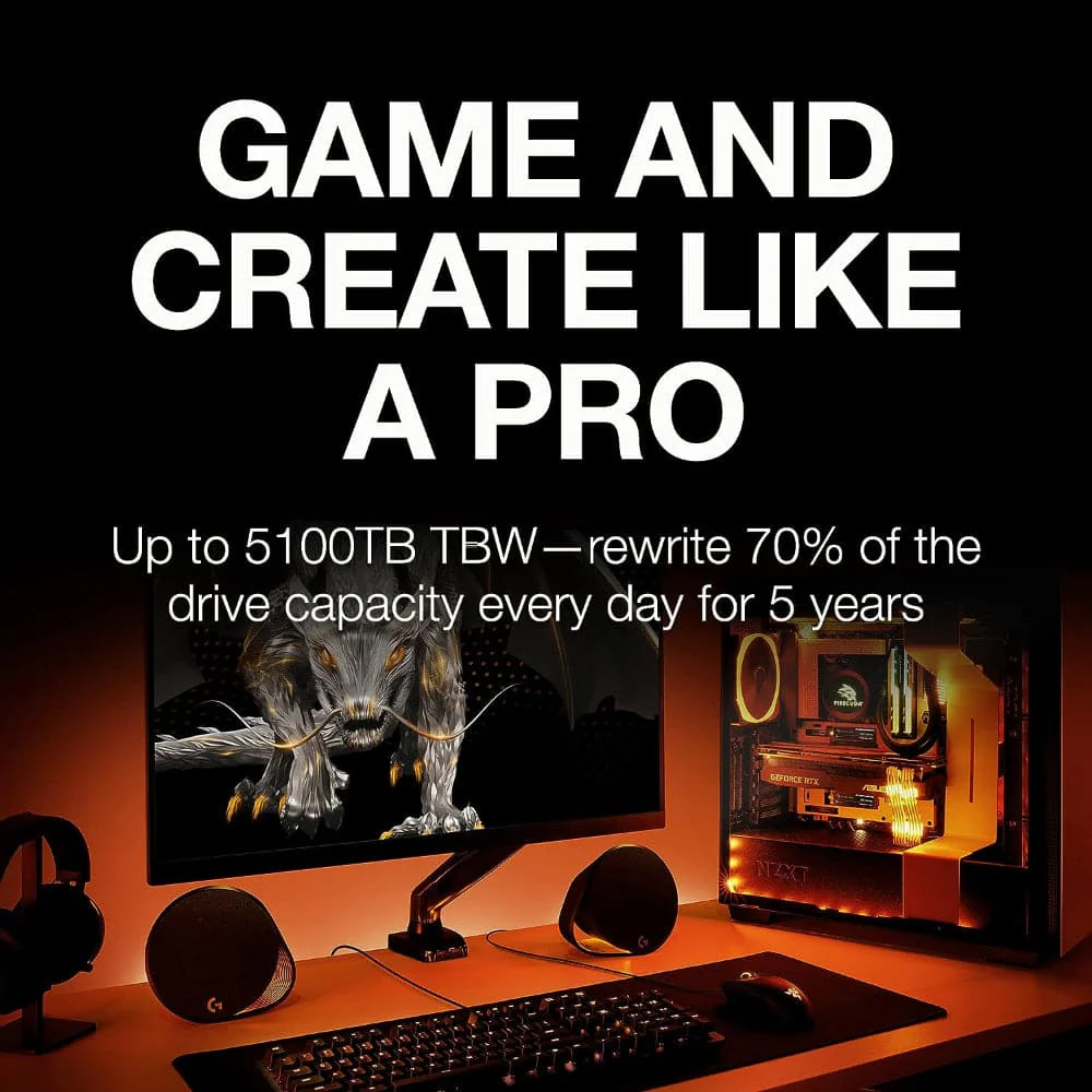 BUILT TO LAST Up to 1200TB TBW means the 2TB drive can write and delete 600GB a day, every day, for five years.