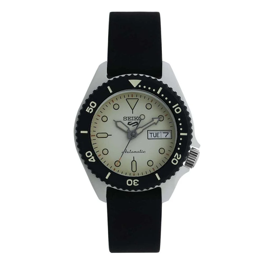 Look stylish and elegant by wearing this watch from Seiko. The round-shaped dial is nestled in a 38 mm case and is secured by Hardlex. It exudes plain 3-hand functionality and features a day and date indicator. This watch works on an automatic movement and is water resistant up to 100 m. Furthermore, it is completed with a buckle clasp to ensure a secure fit on the wrist.