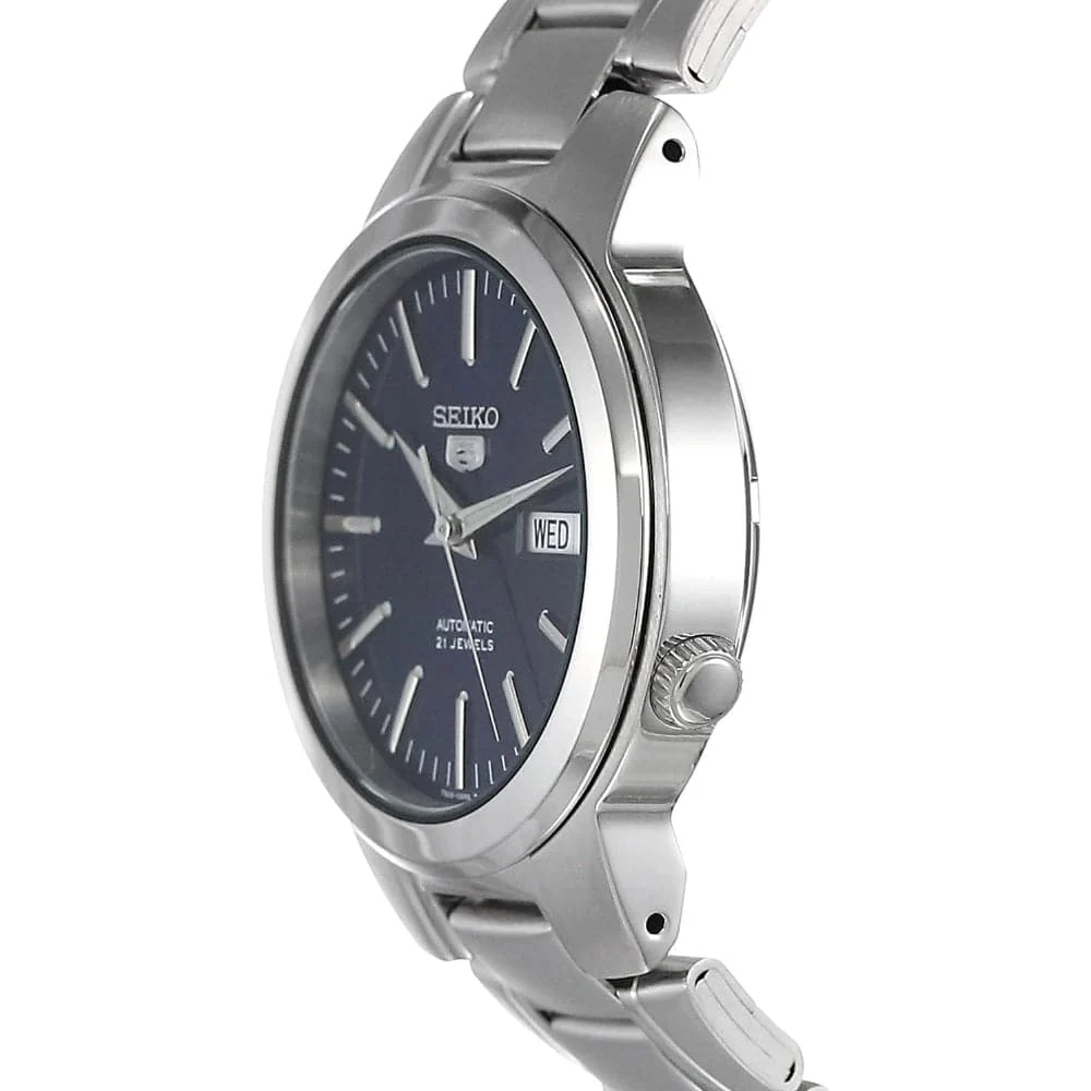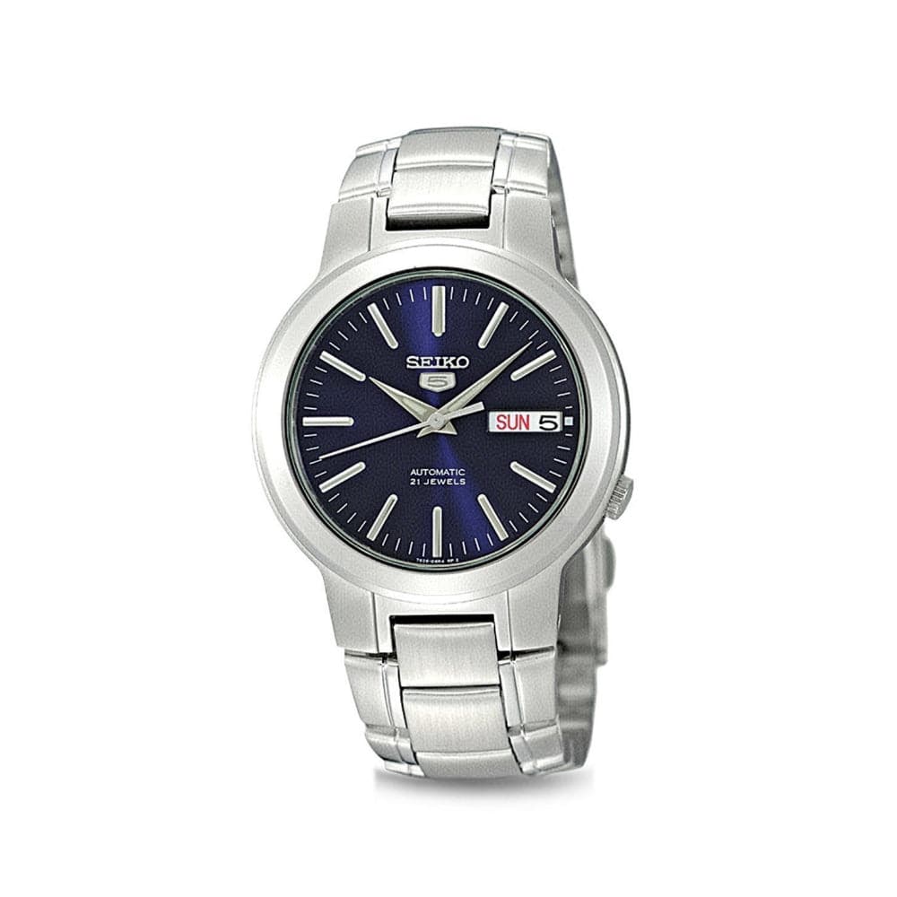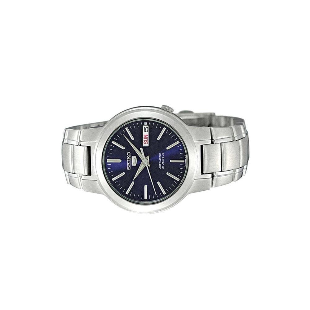 Accessorize your outfits with this smart Seiko analog watch from the Seiko 5 collection. This watch will stay securely on your wrist, thanks to its silver stainless steel bracelet that sports a robust clasp. It features a 37 mm navy round stainless steel dial with Automatic movement for precision. It is also built with a Day and date display that makes it a must-have. Moreover, this Seiko watch is water-resistant by up to 30 m.