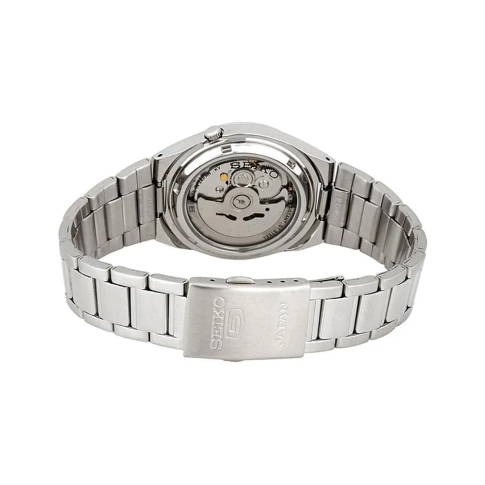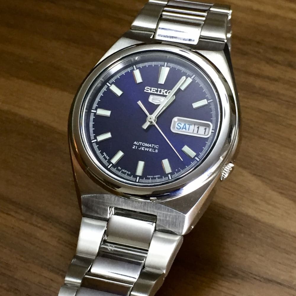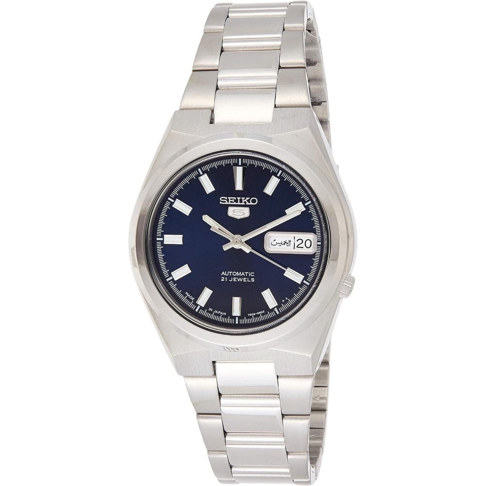 Blue dial. Silver-tone stainless steel case with a silver-tone stainless steel band. Automatic movement. 30 meters / 100 feet water resistance. Fixed bezel. Deployment clasp. Case size 37 mm x 12 mm.