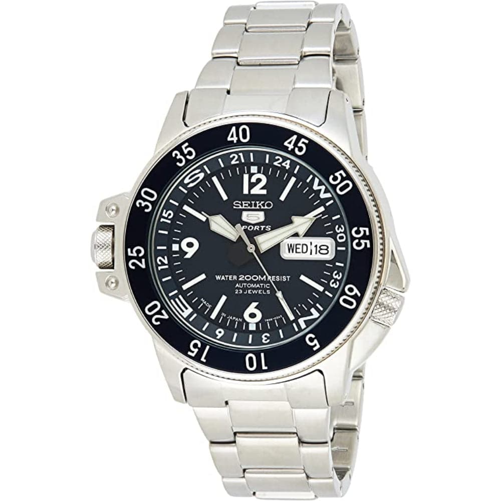 Dark Blue dial enhanced by luminous arrow-shaped hands. Silver-tone stainless steel case with a silver-tone stainless steel band. Automatic movement. 200m water resistance. Unidirectional rotating bezel. Scratch resistant Hardlex glass. Screw on the case back. Foldable with safety lock. Screw-down crown. Case Size: 42mm x 13mm 22mm long band.