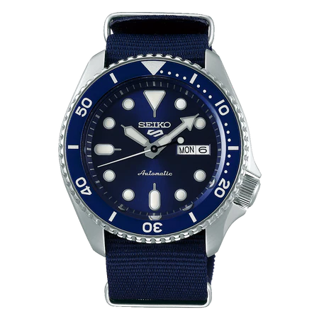 Dressed in eye-catching deep blue tones, this ready-for-action Seiko 5 Sports watch promises longevity on the wrist. It features a 42.5mm stainless steel hard coated case integrated with 100-meter water resistance. The lume-treated appliques on the dial, combined with the markers on a blue coloured unidirectional rotating bezel, enable you to keep track of elapsed time whilst underwater. Aside from a day-date feature at 3 o’clock, this Seiko 5 Sports watch also features the instantly recognisable recessed screw-down crown which resides at the unusual location of 4 o’clock on the case. This Seiko watch secures to the wrist with a comfortable blue nylon band. Meanwhile, the in-house manufactured Calibre 4R36 puts on a show through a see-through caseback made from Hardlex glass.
