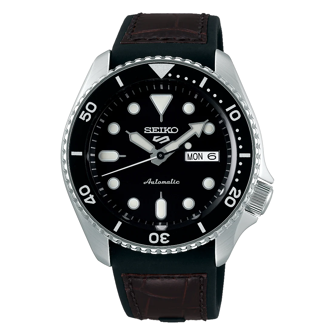 As part of Seiko’s latest range of Seiko 5 Sports watches released in 2019, this model, complete with an eye-catching black silicone and brown leather strap, combines a practical design with a modern aesthetic. The wristwatch is powered by the automatic 4R36 which promises an accuracy of +45 to -35 seconds per day. Encased inside a 100-meter water-resistant steel case with hard coating and a screw-down crown – the movement is protected from the harmful effects of moisture, shocks and corrosion. The LumiBright markers on the watch’s unidirectional rotating bezel match the chunky indexes and hands on the black dial, complete with a legible day-date feature at 3 o’clock. This masculine diving-inspired timekeeping tool combines all the modern functions of the iconic Seiko 5 Sports watch with state-of-the-art materials.