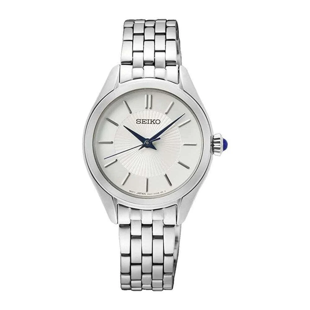 Add a new lease of life to your look with this women’s dress style watch from Seiko with Hardlex crystal glass. Featuring a superb analogue white face in a 29mm diameter 7mm thick case. With a fully adjustable stainless-steel bracelet. This watch is water resistant up to 50 metres. It also comes in its own Seiko Gift Box making it the perfect present. All this with a 2 Year Manufacturers (International) warranty for extra peace of mind.