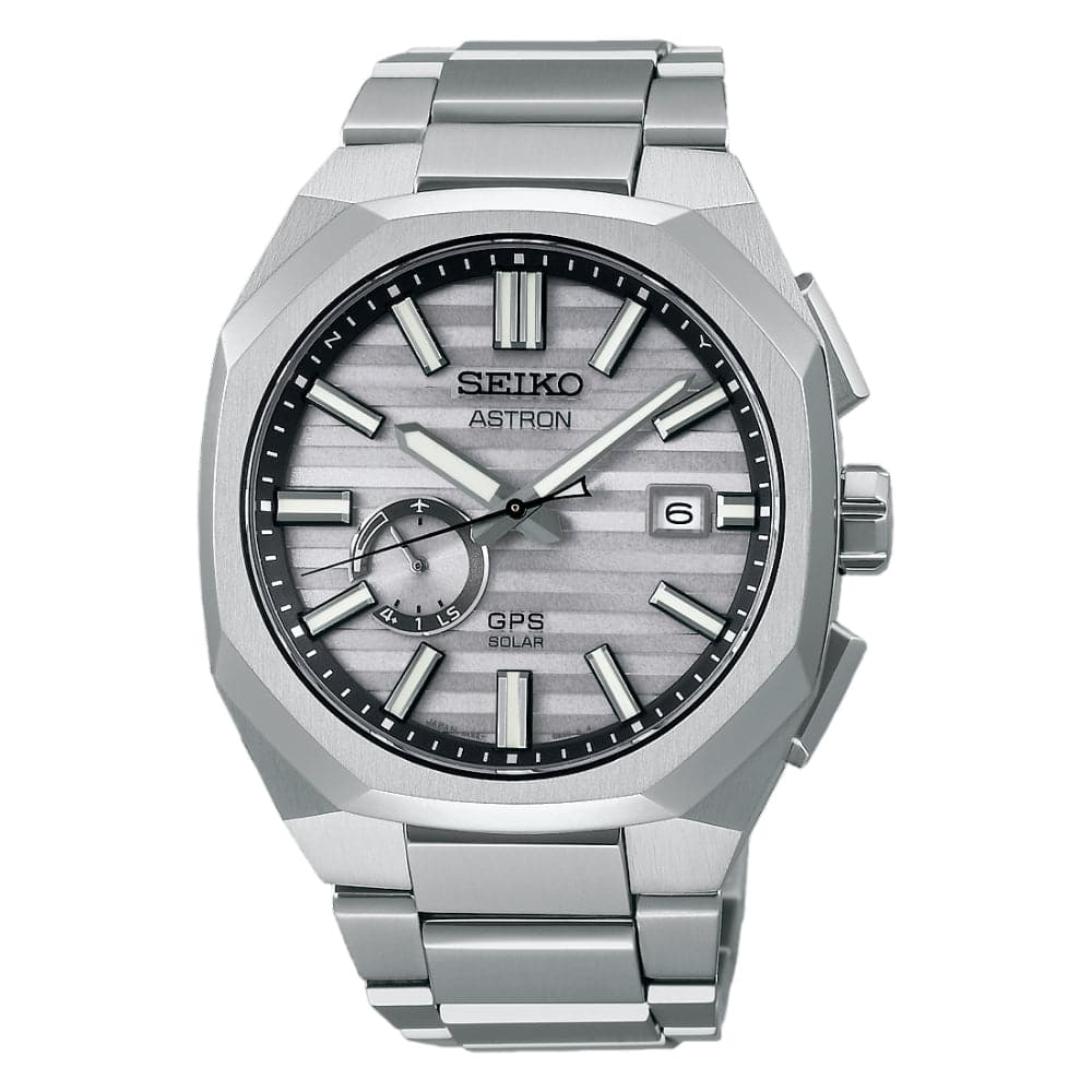 The Astron GPS Solar SSJ013J1 is one of the most advanced wristwatches in the world. It is equipped with a new GPS Solar movement, caliber 3X62, whose improved reception of solar signals has increased the accuracy of the watch. The new series has a dynamic presence thanks to the dimensional case and the faceted bezel with hairline finishing on top, which contrasts with the polished sides. The case lines flow seamlessly through the lugs to an integrated bracelet that has a sharp design that matches the angular case to give the watches a refined appearance. Matched to the color of the bezel, the applied indexes and the hour and minute hands, all filled with Lumibrite, enable easy reading in every viewing condition. The grey dial features a pattern that evokes the quartz crystals used to create the tuning fork-shaped quartz oscillators of the original Quartz Astron introduced by Seiko in 1969. Limited edition 1,500 pieces worldwide.