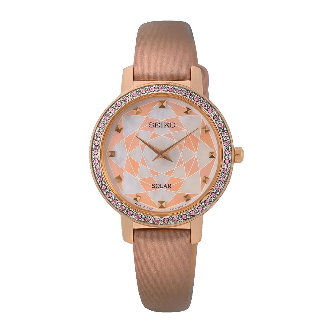 At the heart of this elegant timepiece lies a mesmerizing peach and mother-of-pearl dial that captures and reflects light with a captivating luminescence. Measuring 3 cm in diameter, the dial offers a perfect balance of minimalist charm and detailed artistry, ensuring it complements any attire with grace. Surrounding this enchanting dial is a case adorned with Swarovski crystals, each one meticulously set to enhance the watch’s allure and add a touch of sparkle that is both subtle and striking.