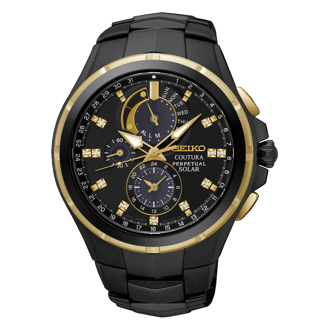 The Seiko Contura features a stunning black and gold solar perpetual chronograph. With polished features and up to 100 meter water resistance, the SSC573P is the perfect timepiece for all occasions. It features a hard coated stainless steel case and bracelet, a solar powered movement with a six month power reserve, a black dial set with 11 diamonds, and sapphire crystal glass.