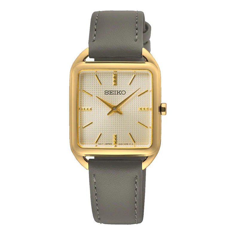 The Seiko Ladies Daywear Square Watch SWR090P exudes subtle elegance with its distinctive 26mm gold-tone stainless steel case and minimalist square design. A softly textured gold dial with refined gold markers and hands offers a delicate balance of simplicity and sophistication, making it a standout piece in the casual and minimal watch category. Crafted for women who appreciate timeless style, this quartz women’s watch features a precise 4N30 movement with ±15 seconds per month accuracy and a durable Hardlex glass for everyday resilience.